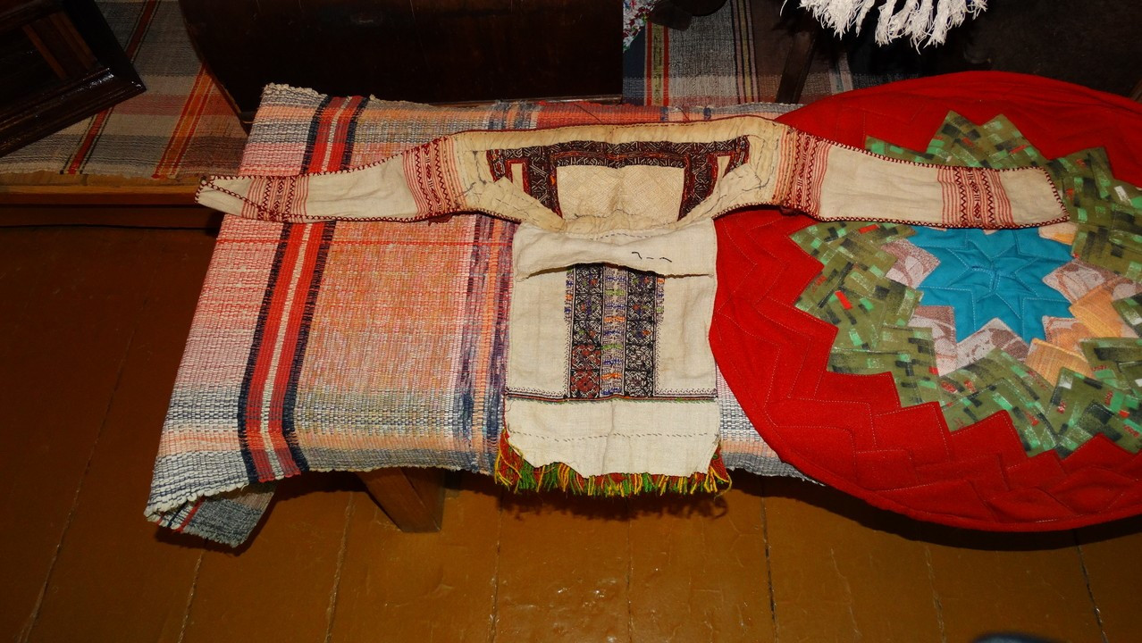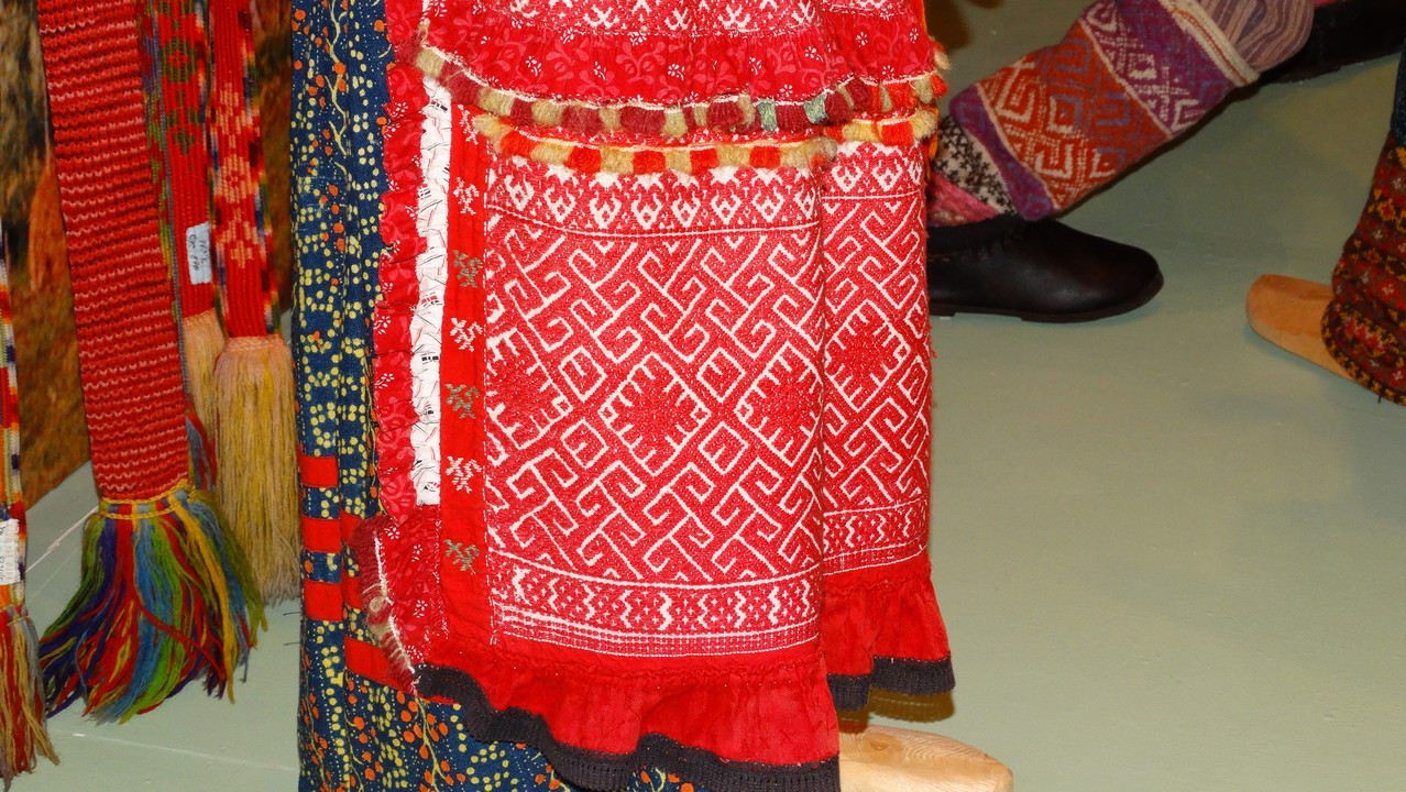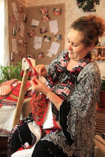 В центре мы познакомились с Надеждой Майковой, известной во всей Марий Эл мастерицей, автором обширной коллекции вышитого марийского костюма. С присущей ей скромностью, Надежда Евсеевна параллельно с готовкой для гостей чая, организацией доставки к столу торта, извлекала на наших глазах из многочисленных сундуков и берестяных коробов настоящие произведения искусства – старинные, вышитые еще в XIX – начале XX веков национальные марийские костюмы и головные уборы. Но истинное открытие ожидало нас, когда мастерица продемонстрировала собственные работы, являющиеся точными копиями старинной техники вышивания «с изнанки».