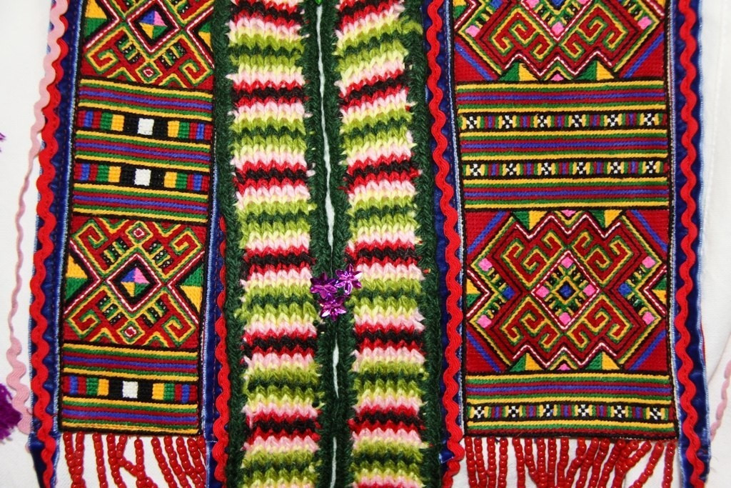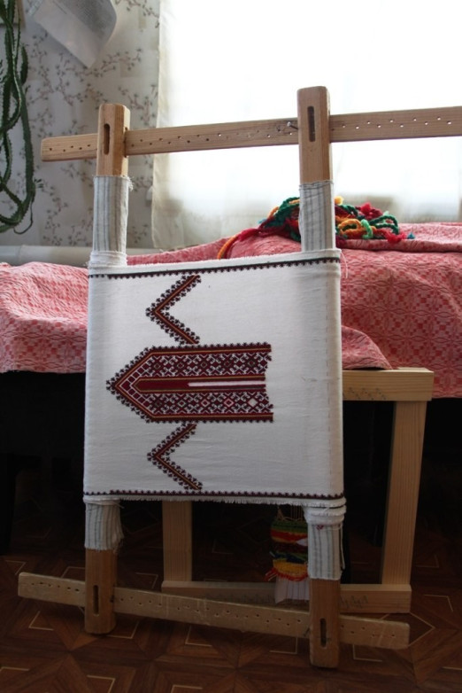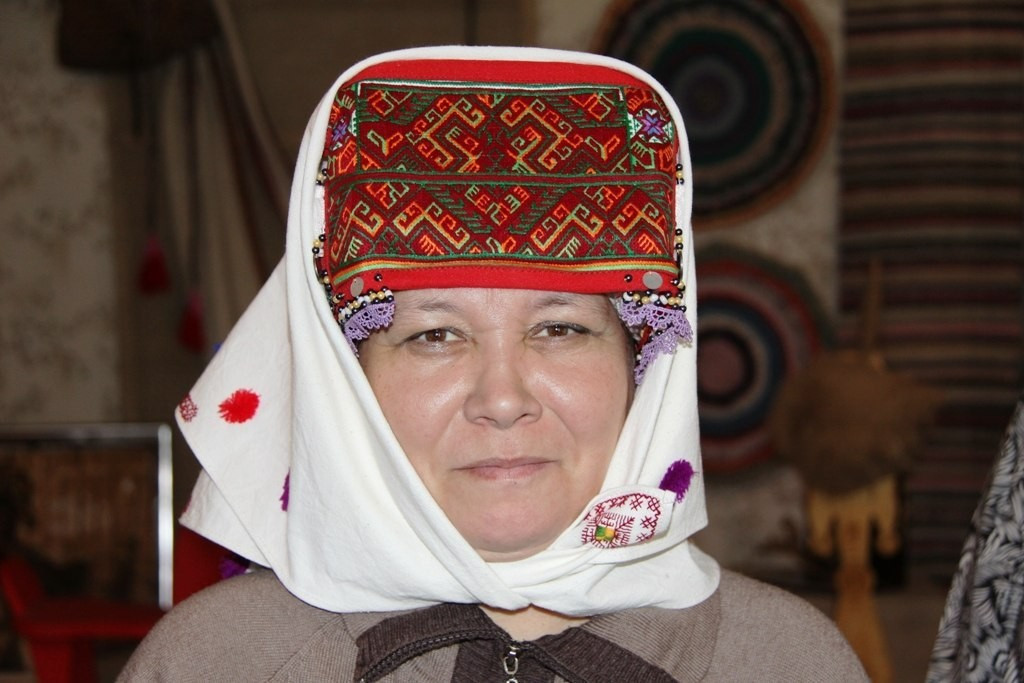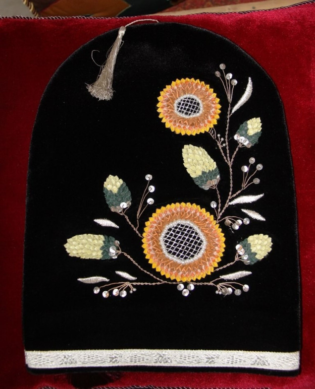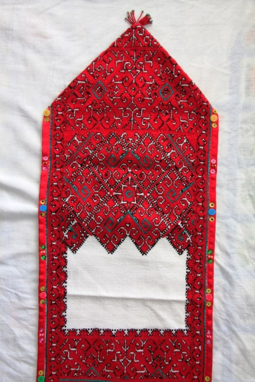 - Вот здесь стежок чуть короче, а вот тут – длиннее, я сама долго рассчитывала какое количество стежков необходимо сделать для того, чтобы вышивка смотрелась одинаково с обеих сторон для придания этому головному убору, называемому «шымакш», правильного вида, такого, как вот этот образец, созданный руками местной мастерицы в конце позапрошлого века.