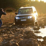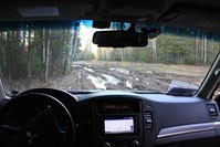 Наблюдая акробатические жесты Валерия, корректирующего прохождение наиболее опасных участков пути, и опасные крены автомобиля, я сделал наиболее эффектные кадры, лелея надежду на то, что до наступления полной темноты мы все же прорвемся к большой земле и к «улучшенному дорожному покрытию».