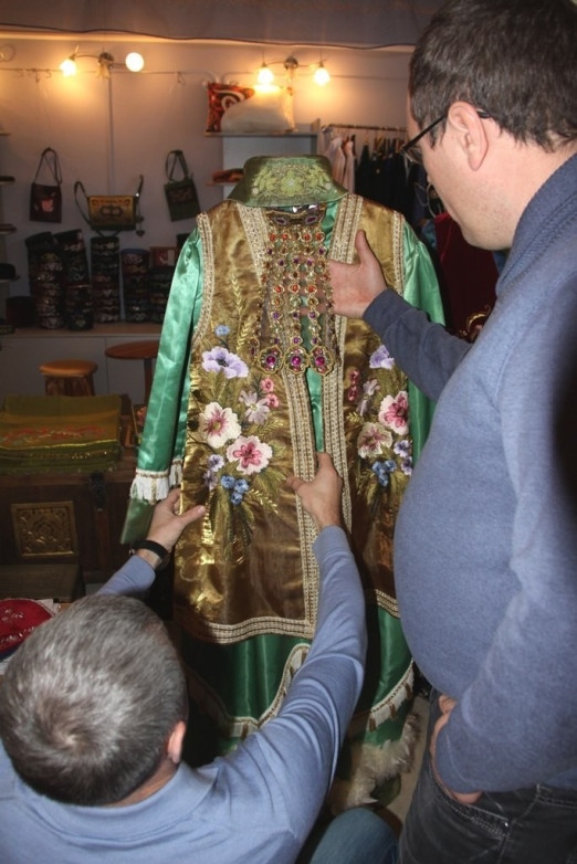 В сувенирном магазине «Туран-Арт» Суфия ханум продемонстрировала участникам экспедиции разнообразные панно, шамаили, молитвенные коврики - намазлыки, обрядовые (свадебные, для Сабантуя, других празднеств) и сувенирные полотенца – «Казан селгесе», декоративные подушки, коврики – келэмы, женская и мужская одежда (платья, камзолы, чапаны), узорные кожаные ичиги, головные уборы (каляпуши, калфаки), аксессуары к костюму (сумочки, косметички, очешники).