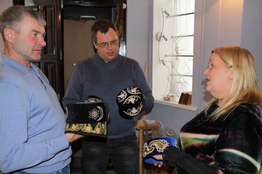 После интересной экскурсии по ателье, знакомства с мастерицами и технологиями, ими используемыми, после милой беседы за чаем с традиционным татарским «чак-чаком», Олег и Валерий, проникшись невероятной красотой золотного шитья, приобрели для музея калфаки – традиционные женские головные уборы и каляпуш, или попросту тюбитейку, являющийся атрибутом мужского костюма. Напоследок никогда не унывающая Суфия ханум, являющаяся примером истинной бизнес-леди и, вместе с тем мецената, исследователя, популяризатора национальных традиций в одном лице, презентовала нам замечательный фотоальбом с многочисленными иллюстрациями произведений мастериц «Туран-Арт».