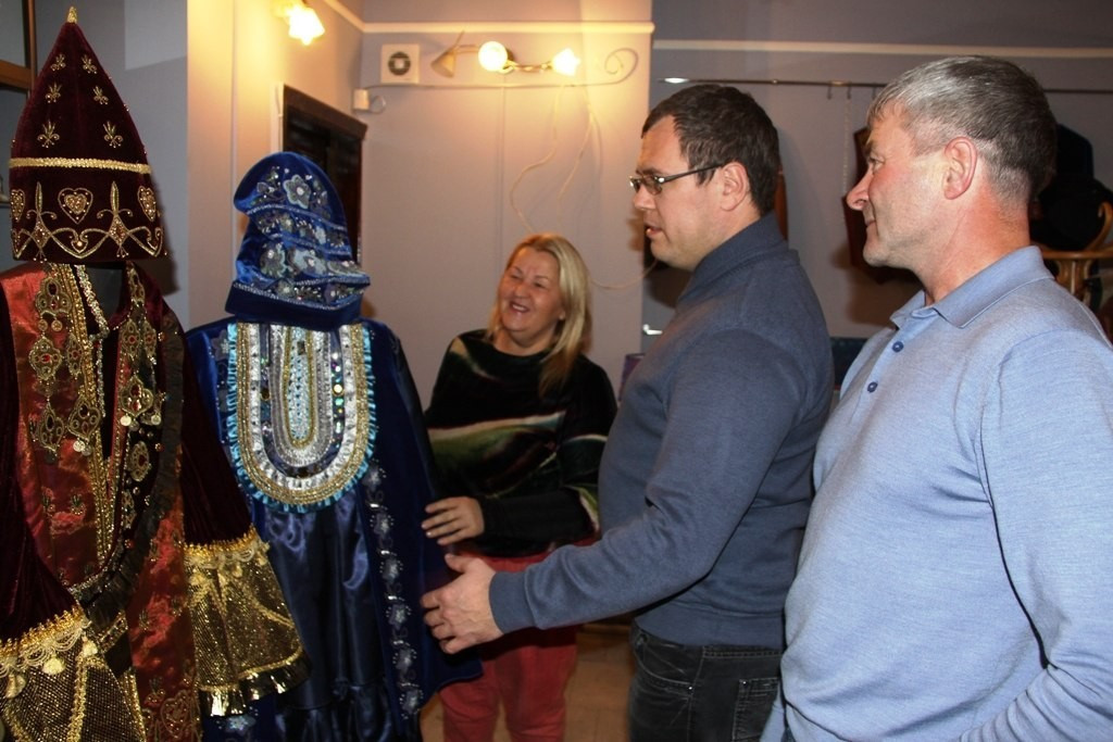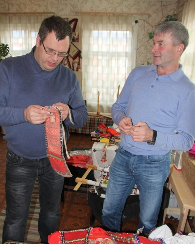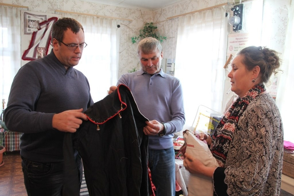 Олег и Валерий буквально засыпали мастерицу вопросами о том, каким образом воссоздается техника вышивки национального марийского костюма.