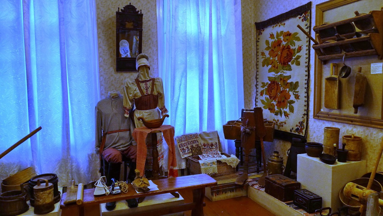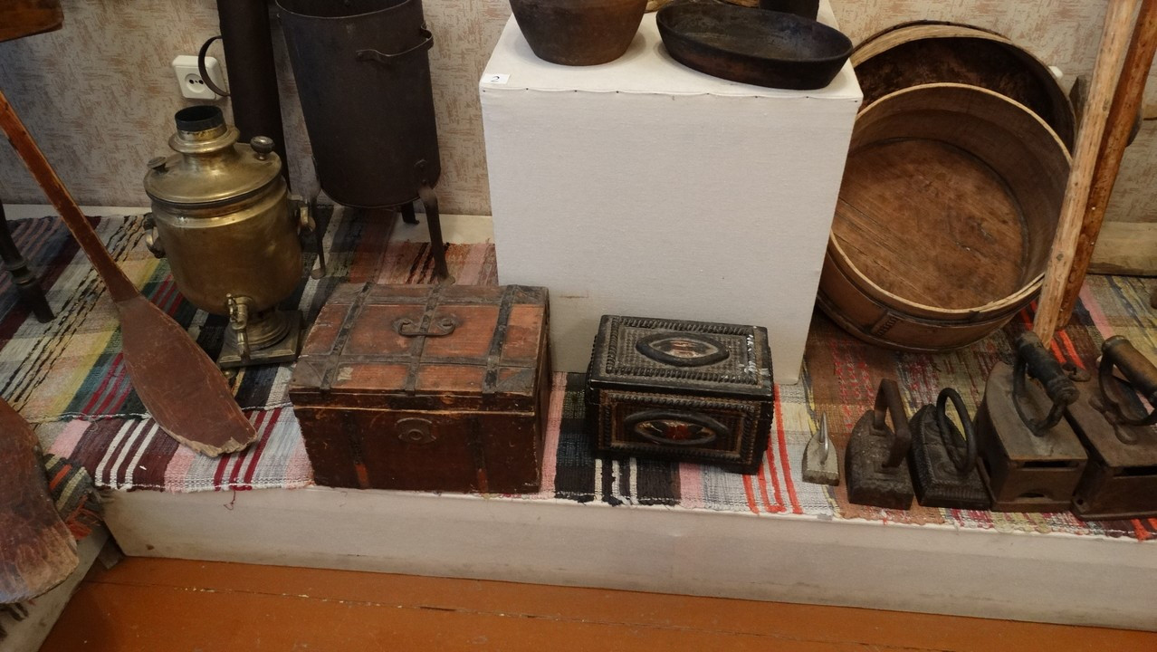 Видимо правду говорят, что у каждого предмета своя история и жизнь, что есть музеи, из которых «не хочется уходить» (так пишут в откликах о хороших музеях). Музей в Объячево замечателен тем, что предметы этнографического зала, датированные нач.XVIII по нач.ХХ вв., живут не за стеклом витрин, а в бревенчатой избе, на полочках, стенах, в сундуке …