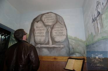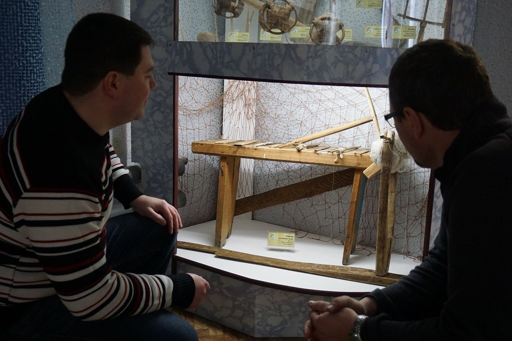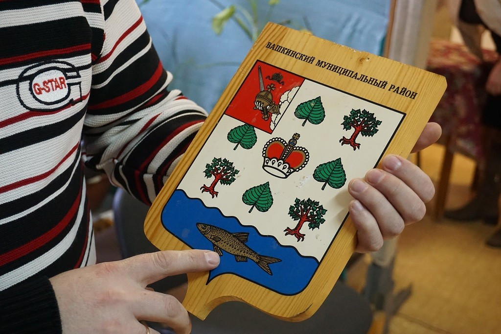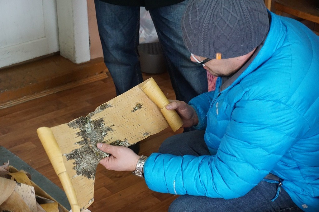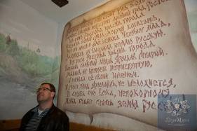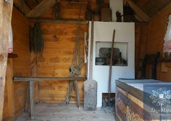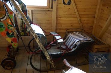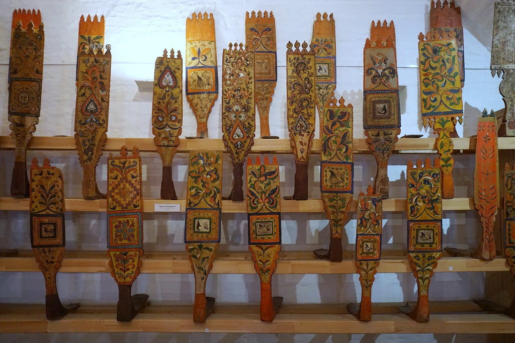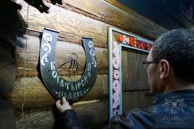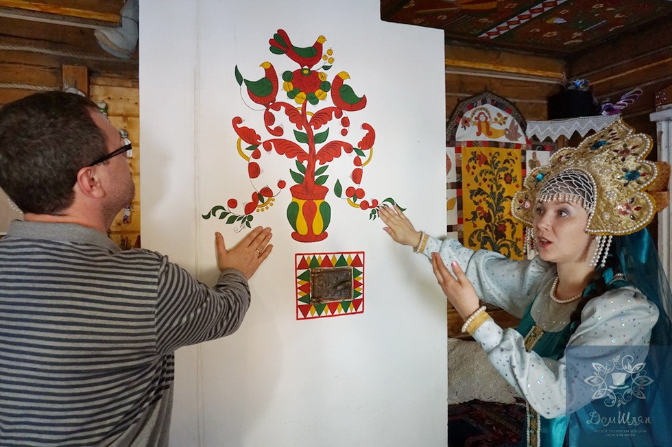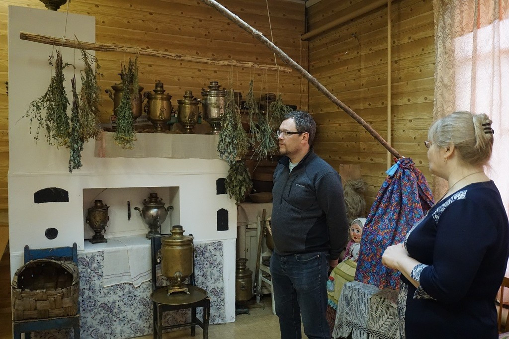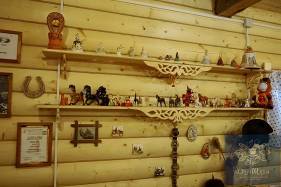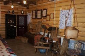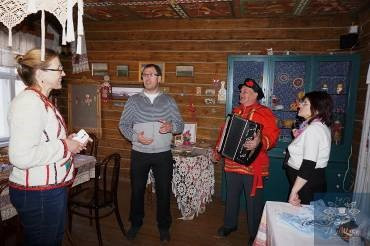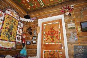 Обменявшись подарками, знакомимся с избой; на стенах представлена объемная выставка резных изделий из липы.