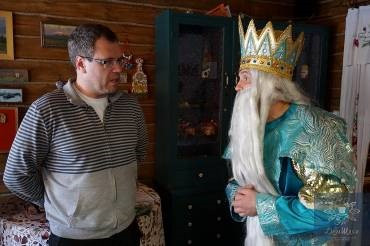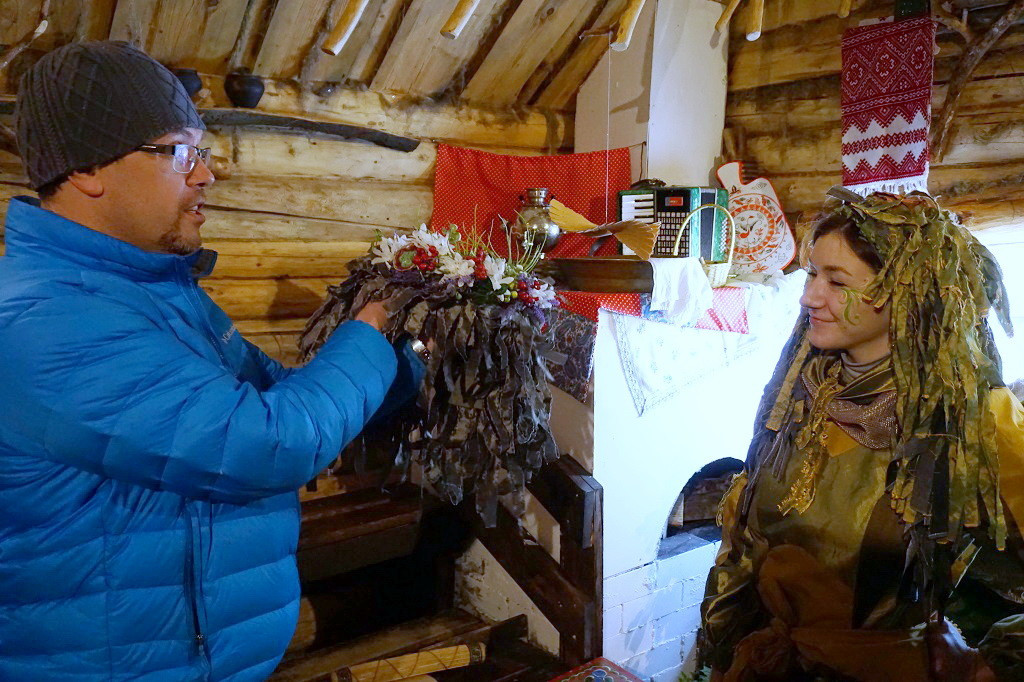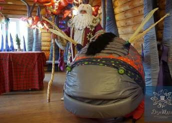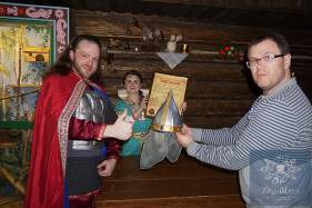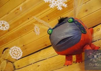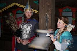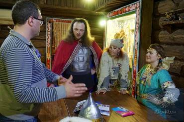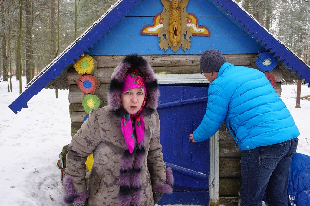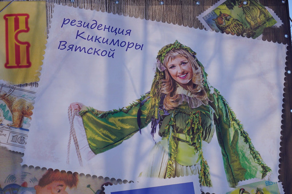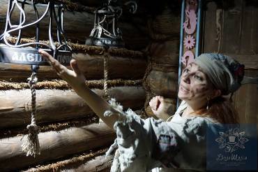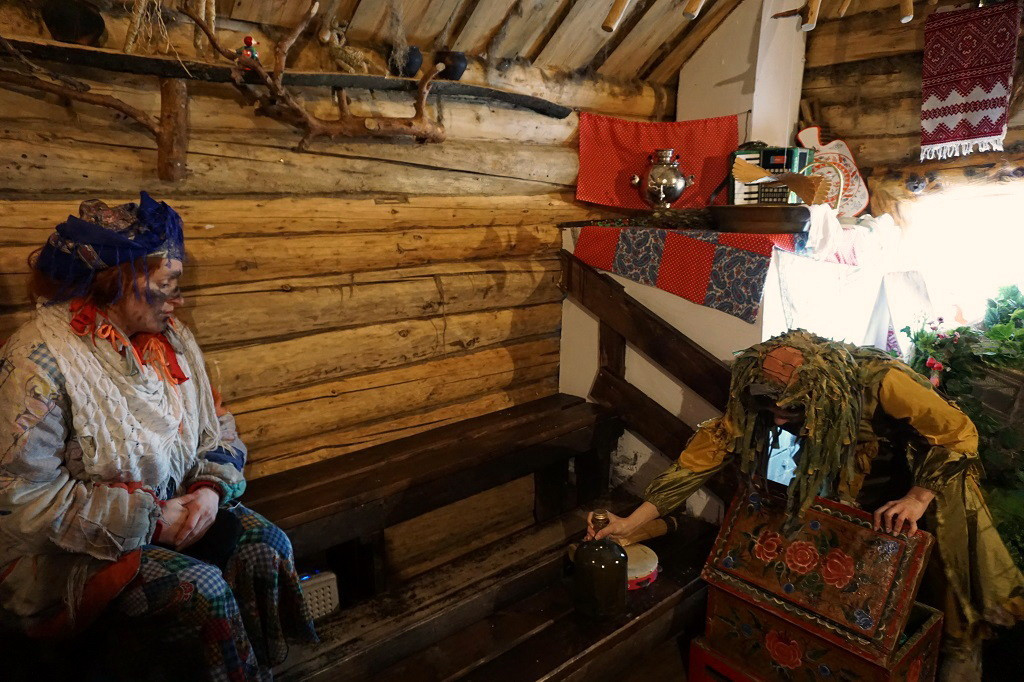 Пройдя испытания, состоявшие из потешных конкурсов по закидыванию валенка с большого расстояния в сундук, по удержанию волшебного яйца Курочки Рябы на тонкой палке, мы получаем-таки приглашение пройти в волшебный, просторный дом на курьих ножках, а в нем тепло и уютно, по стенам вещи сказочные развешаны, лавки и сундуки стоят, а в углу, с кровати среди тины зеленой да трав болотных мирно спит, похрапывая, сама вятская Кикимора.