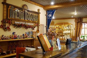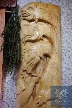Резьба по дереву, судя по всему, в большом почете у Бабы-Яги, местным мастерам действительно есть чем удивить взыскательных туристов. Повсюду на стенах красуются крупные композиции, выполненные по мотивам русских сказок, по библейским сюжетам.