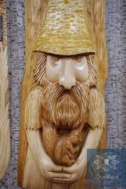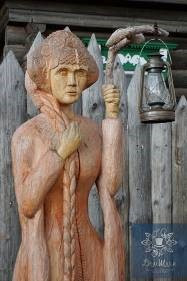 Сама хозяйка тоже увековечена в дереве, в руках держит она увесистую метлу, поодаль застыла на ветви сова…