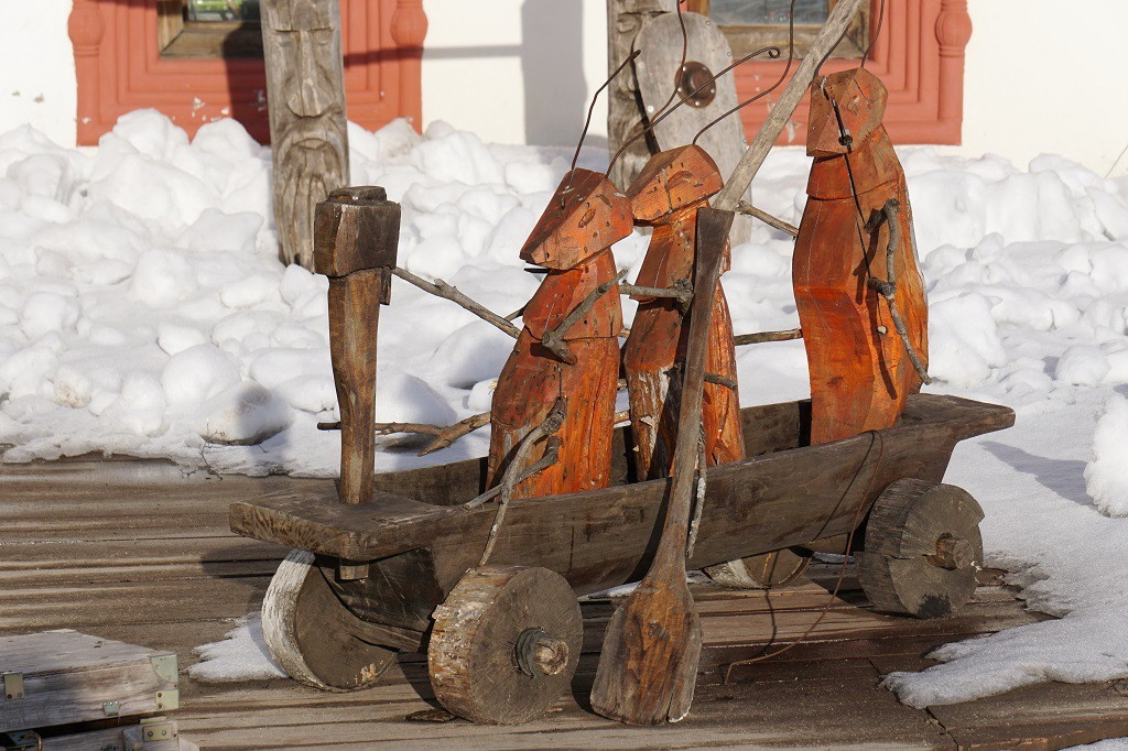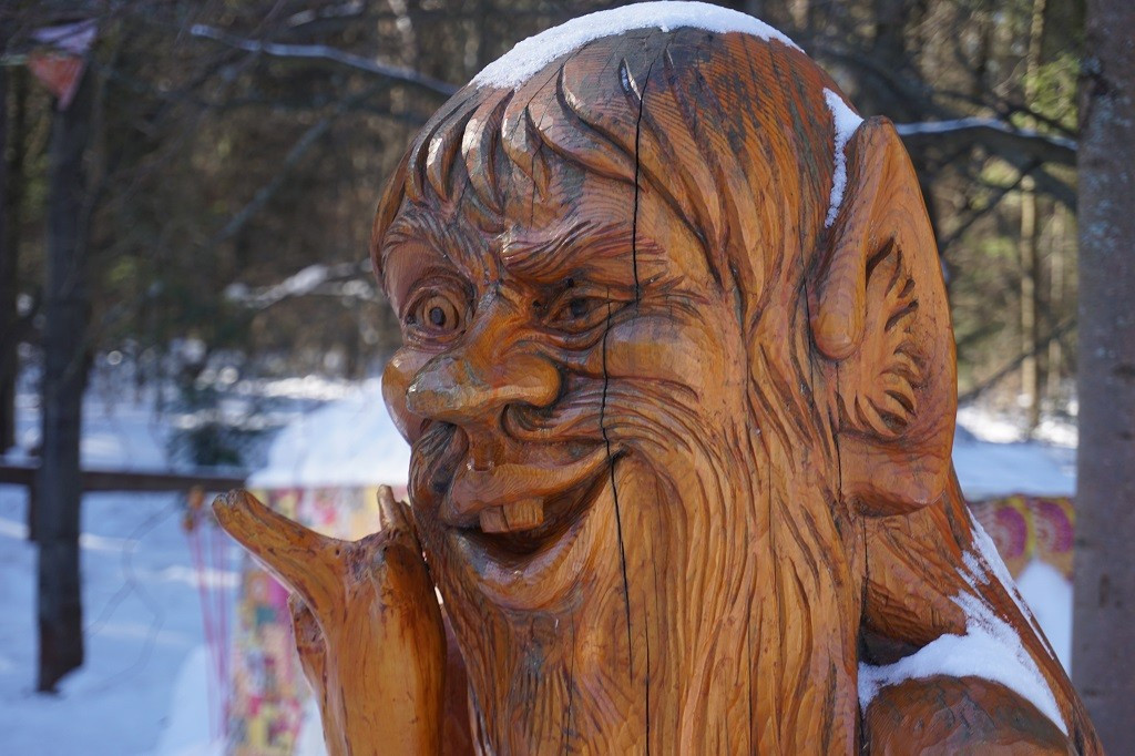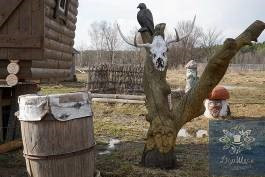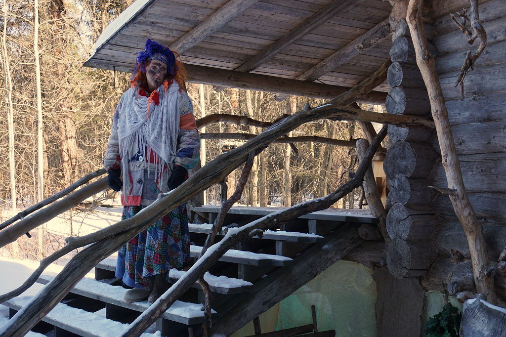 На территории возле дома Яги – множество застывших в деревянных скульптурах персонажей, тоже как будто зачарованных.