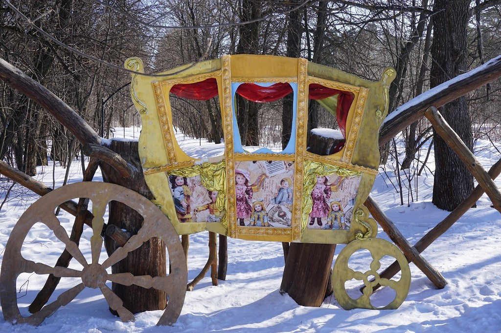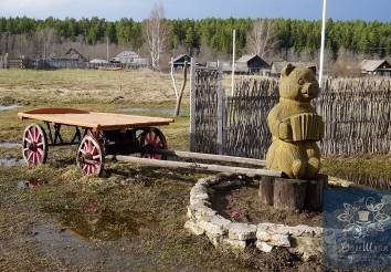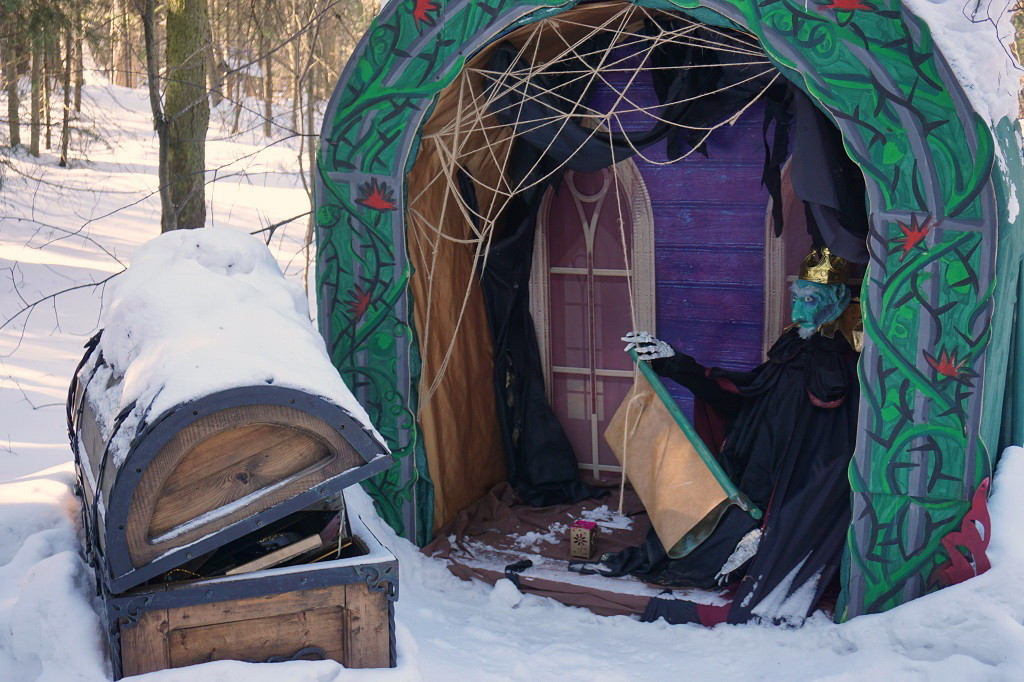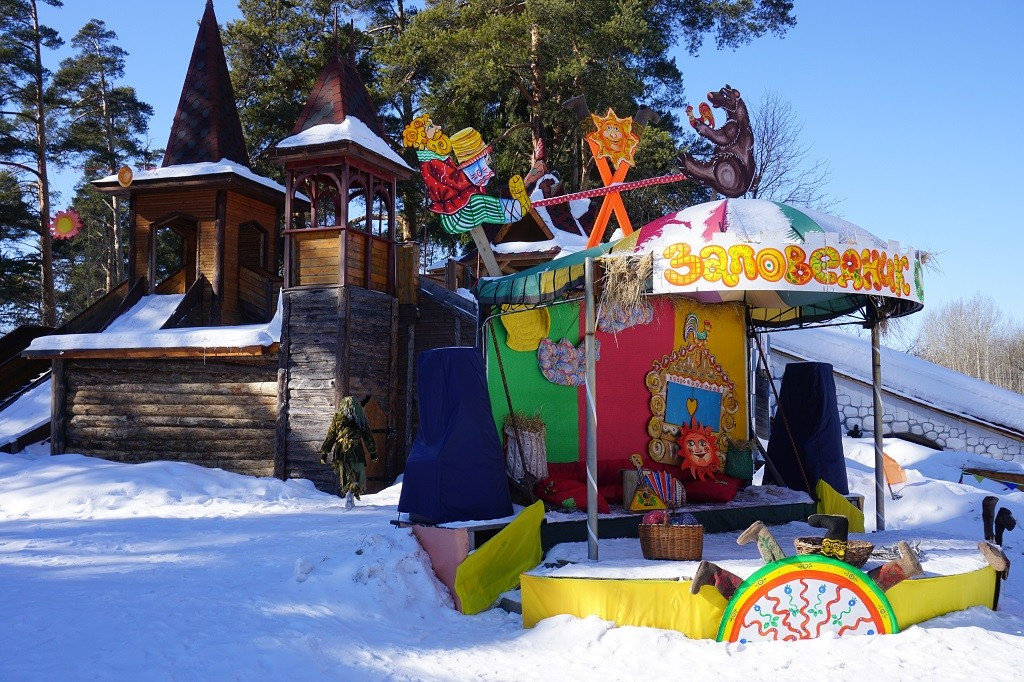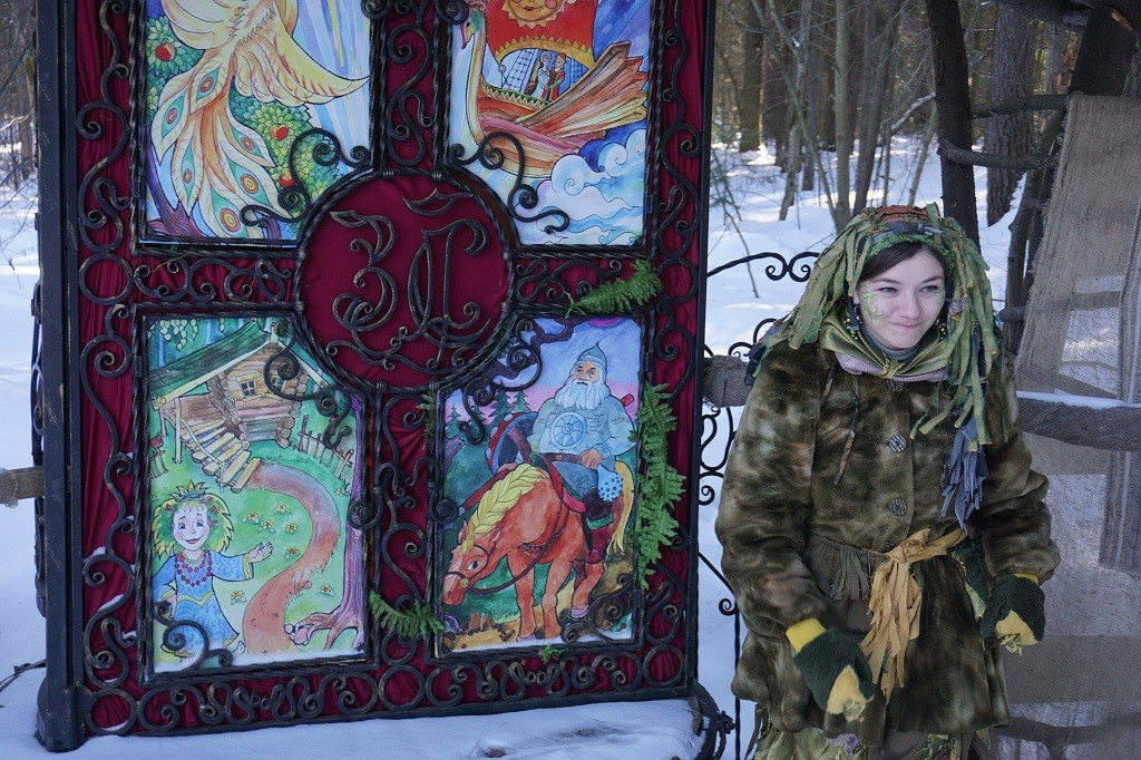 Здесь медведи, запряженные в телеги, богатыри, огромные грибы, лесные человечки, Леший, чуть поодаль – сказочный домик самой обитательницы этих мест, рядом с ним – коряга с лосиным черепом да транспортное средство Яги – ступа.