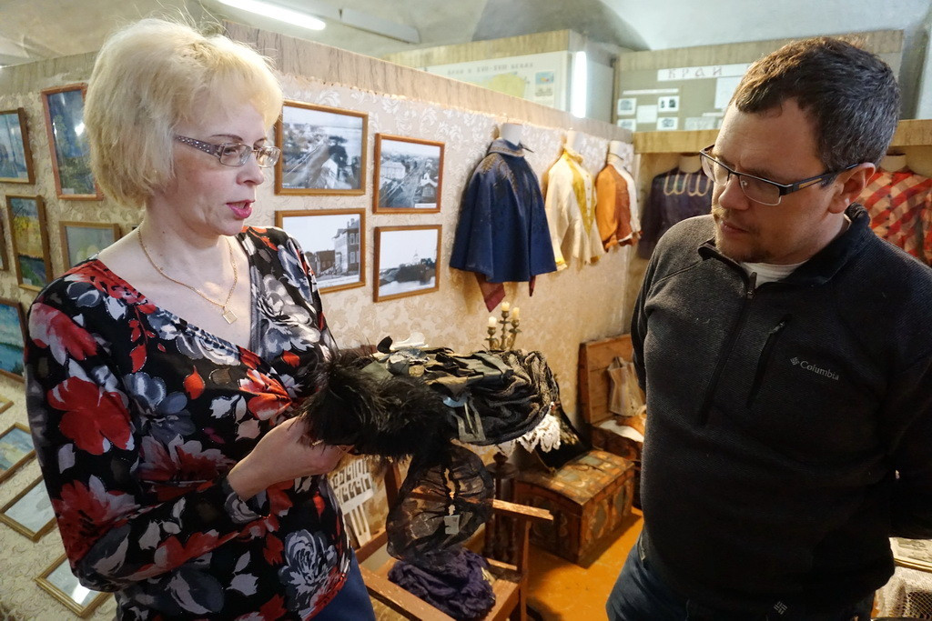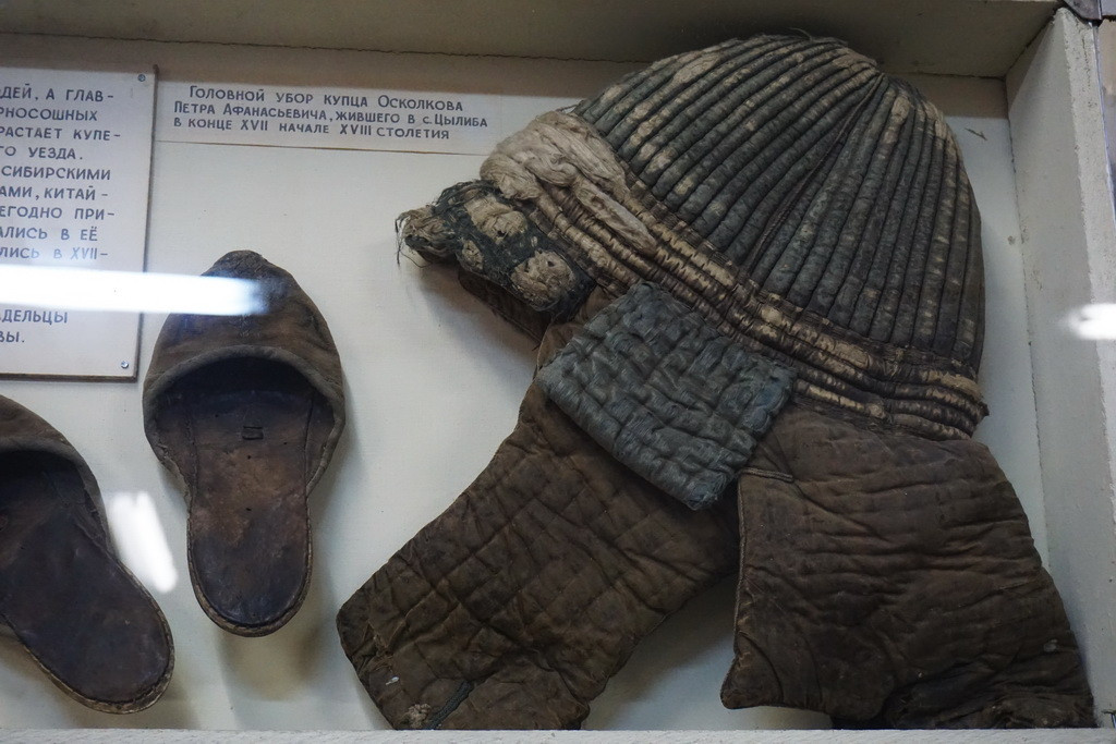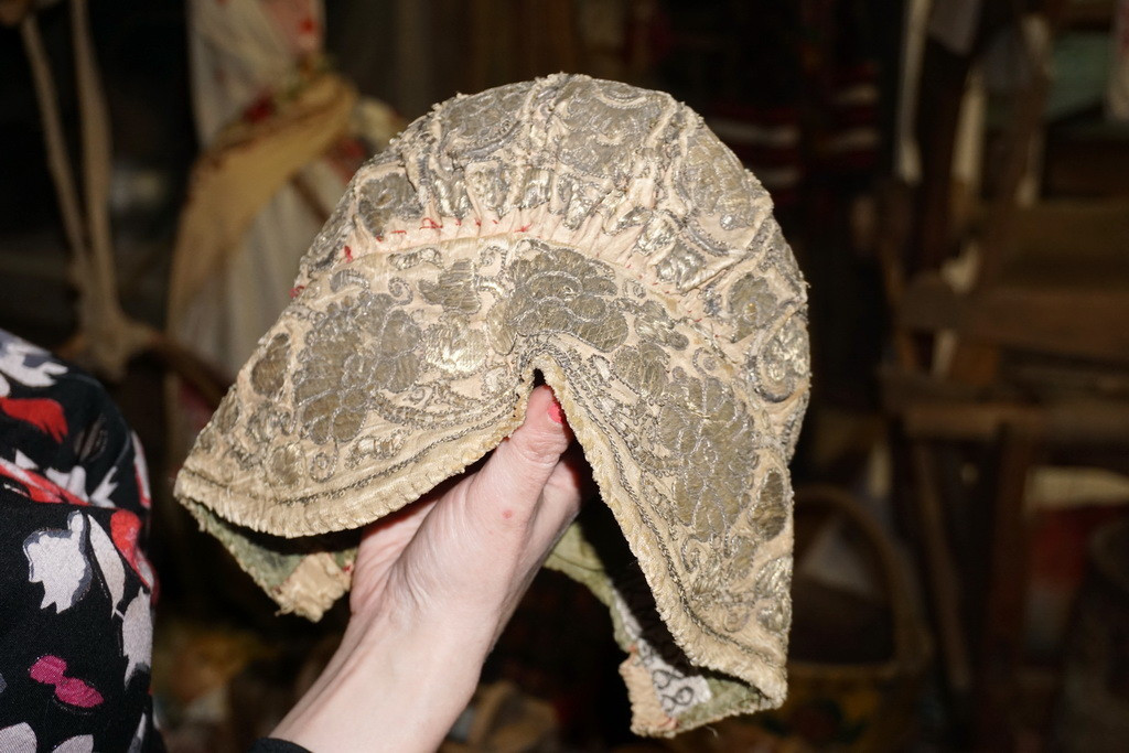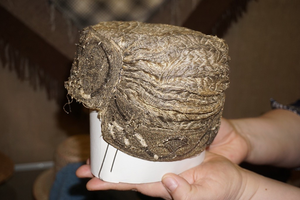 Сотрудник отдела фондов, узнав о цели нашего приезда, продемонстрировала несколько оригинальных старинных женских головных уборов – сборников, изготовленных местными мастерицами из шелка и парчи.