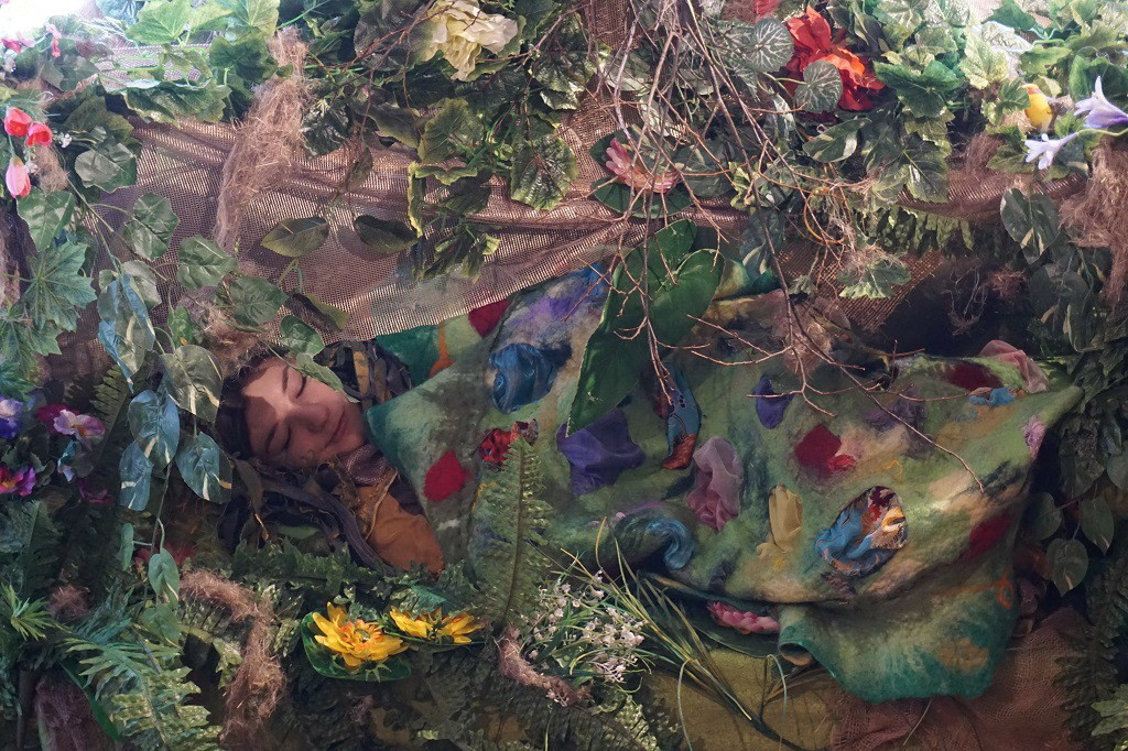 Тол Бабай проводит для нас небольшую экскурсию по своим владениям: терем разделен на четыре зоны, каждой соответствует свое время года, среди диковинных сюрреалистических пейзажей – невероятные существа, из них узнаваем разве что только Серый Волк, бабочки здесь 3-метровой длины, с четырьмя лапами, толстым тельцем и крохотными крылышками, птицы экзотические сидят на ветвях, летучие мыши-вампиры замерли под сводами терема…