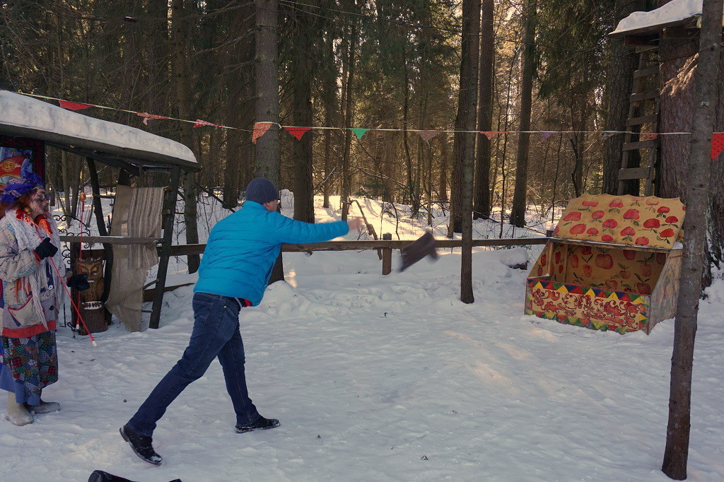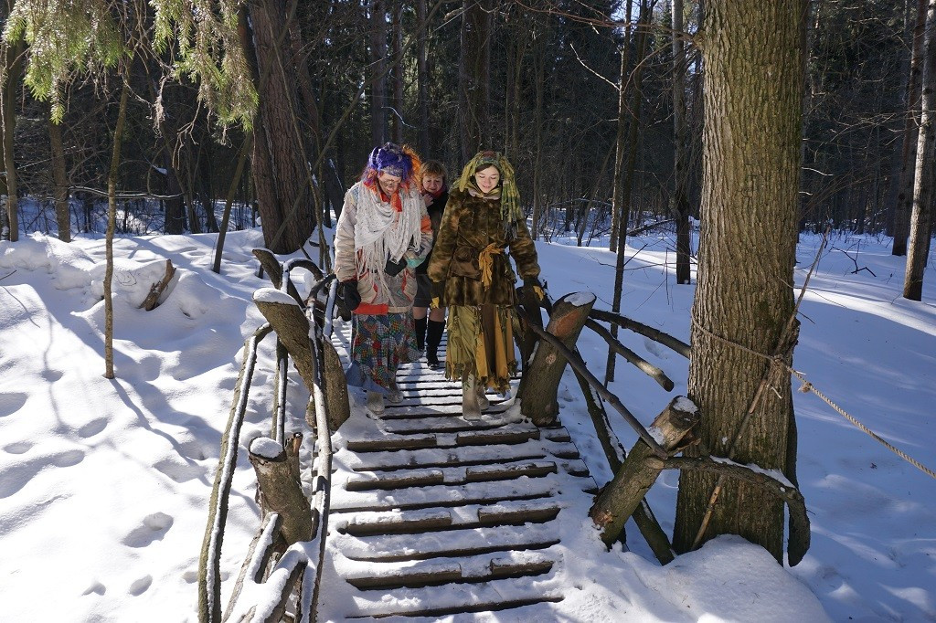 Мы с радостью соглашаемся, и в сопровождении двух лесных жительниц Бабы Яги да Кикиморы, идем в зимний лес, который, впрочем, на самом деле становится всё темнее и гуще. Все здесь волшебное: пни да коряги болотные, вот среди них стоит огромный, метра 4 в высоту Меч-Кладенец.