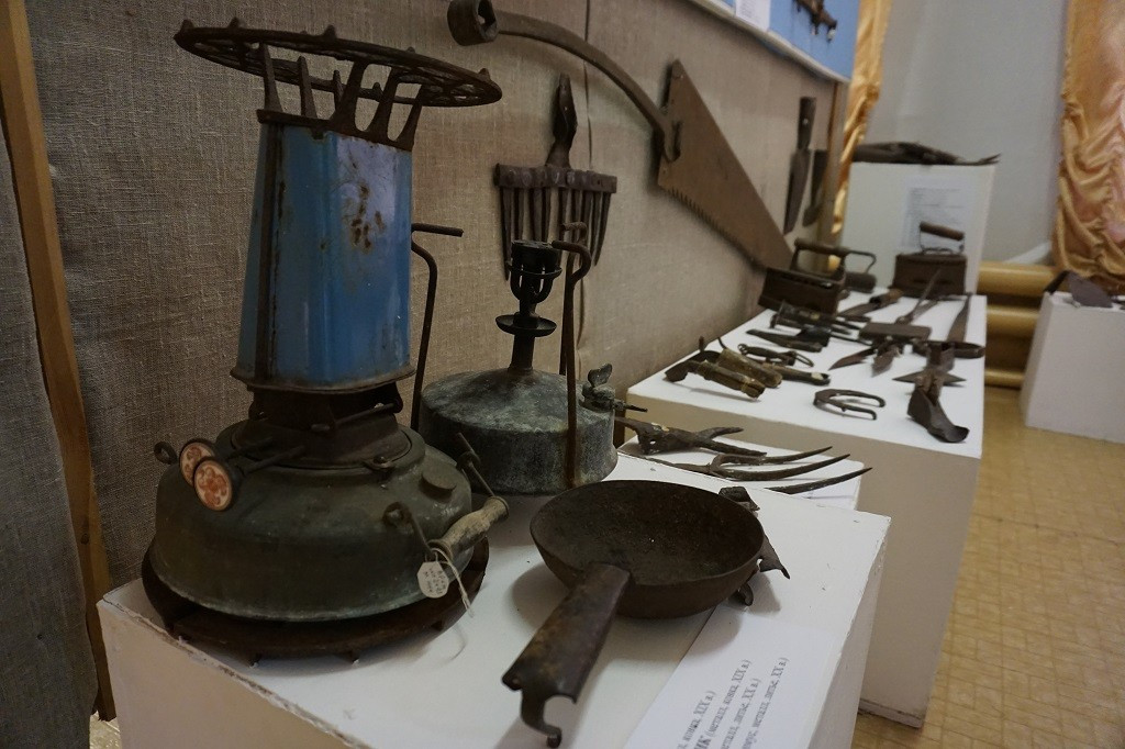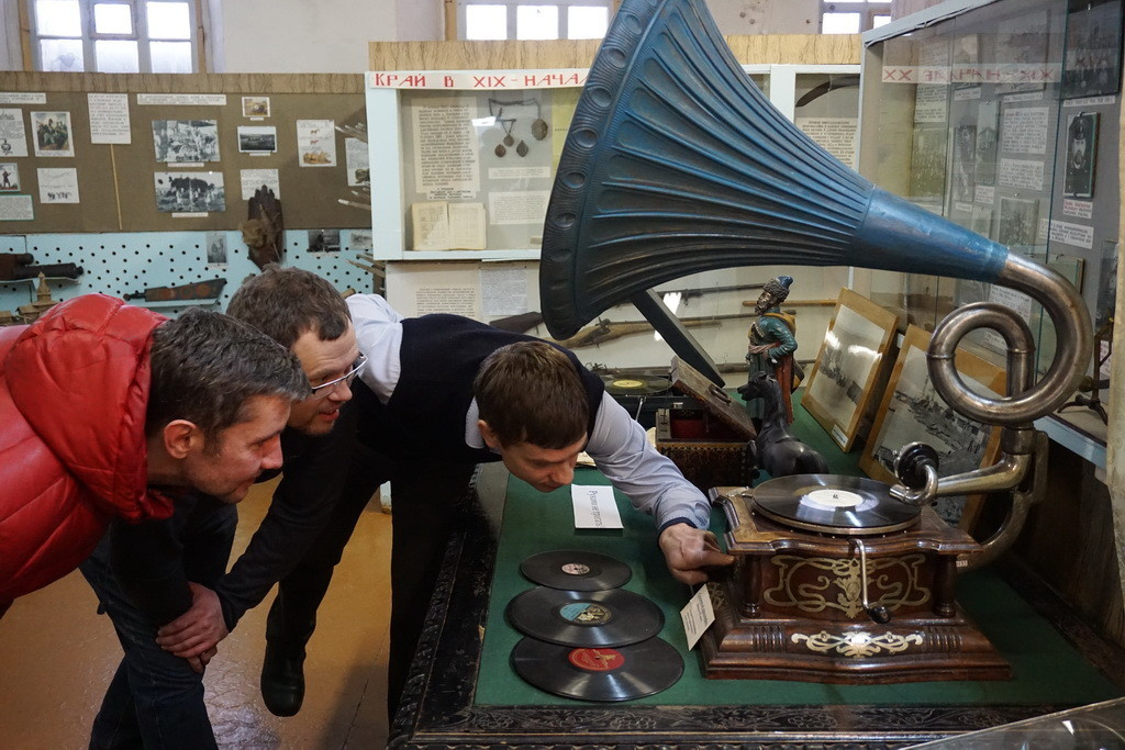Под церковными сводами разместились многочисленные экспонаты: обычные в наших северных краях кости гигантов ледникового периода мамонтов, бизонов да шерстистых носорогов, диорама с чучелами обитателей уже современных таежных лесов, огромных размеров старинный стол, изготовленный из мореного дуба и привезенный аж из самого Санкт-Петербурга, удивительной сохранности работающий патефон с лейблом «Made in New York», головной убор местного купца, чудом сохранившийся в течение нескольких веков…