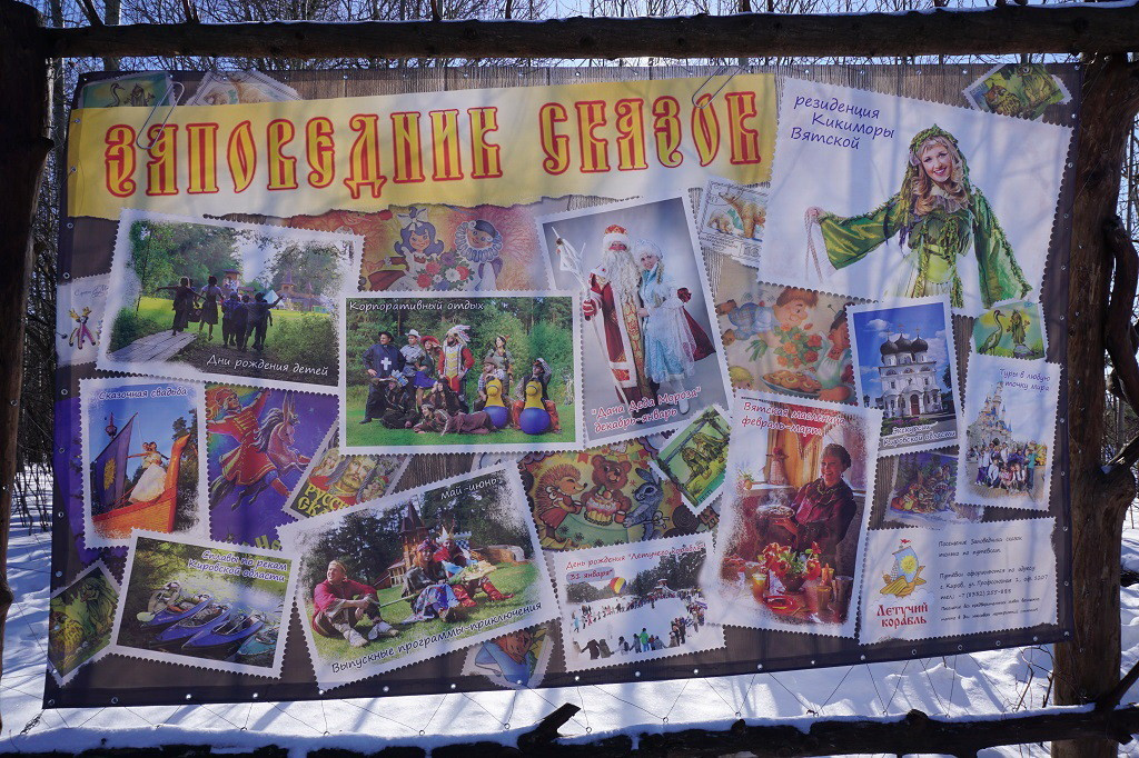 Называется это чудо-место «Заповедник сказок»! И действительно, пересекая реку Вятку по «старому мосту» и повернув на поросшую густым лесом пойму, мы по слегка потянутой весенней распутицей дороге выезжаем в царство матушки-зимы, где по утреннему насту скользят счастливые лыжники-одиночки, на могучих соснах весело чирикают синицы и воробьи, а высокие сугробы сверкают на ярком солнце бесчисленными ледяными кристалликами.