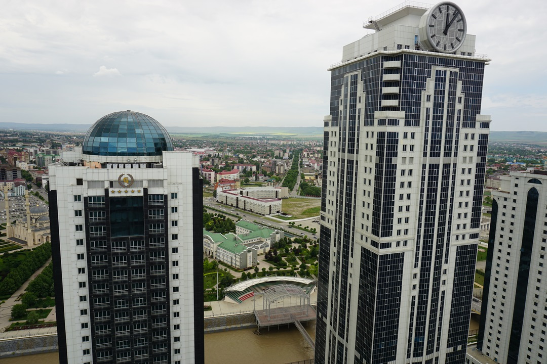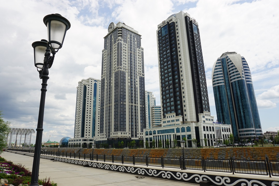 Далее направляемся в расположенный поблизости комплекс «Грозный-Сити», состоящий из 8 зданий. Высота их – до 120 метров, самым высоким на данный момент зданием в городе является жилая высотка, входящая в состав комплекса, в остальных небоскребах расположены офисные помещения и 5-ти звездочный отель «Грозный-Сити».