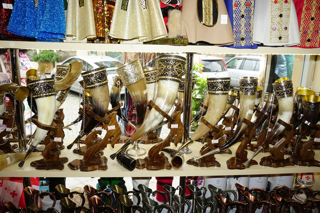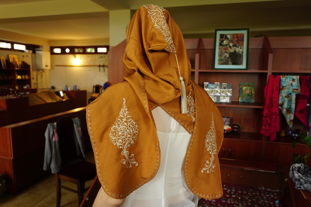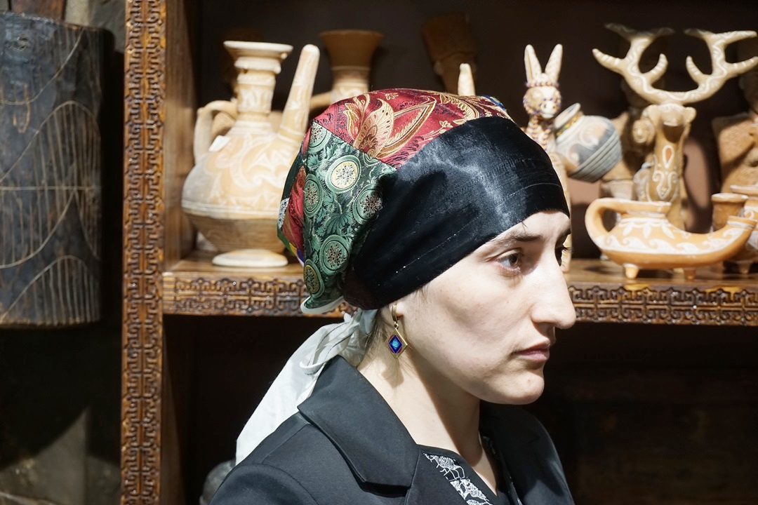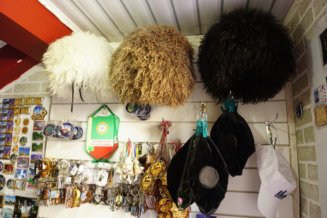 В сувенирном магазине, расположенном на первом этаже центра, Олег и Валерий приобрели три женских национальных головных убора для коллекции музея «Дом шляп», это кубачинский «каз» и два «чохто», каз представляет из себя головной платок, расшитый декоративными элементами, выполненными золотой нитью.