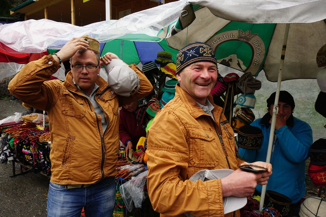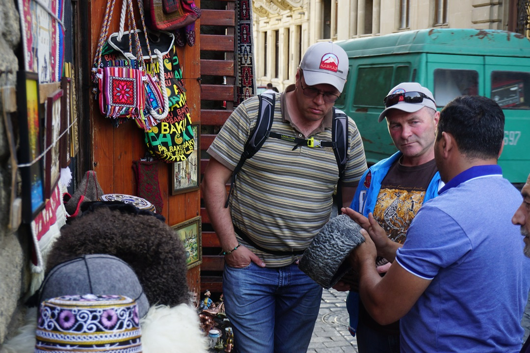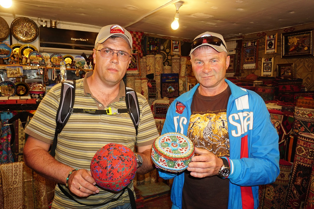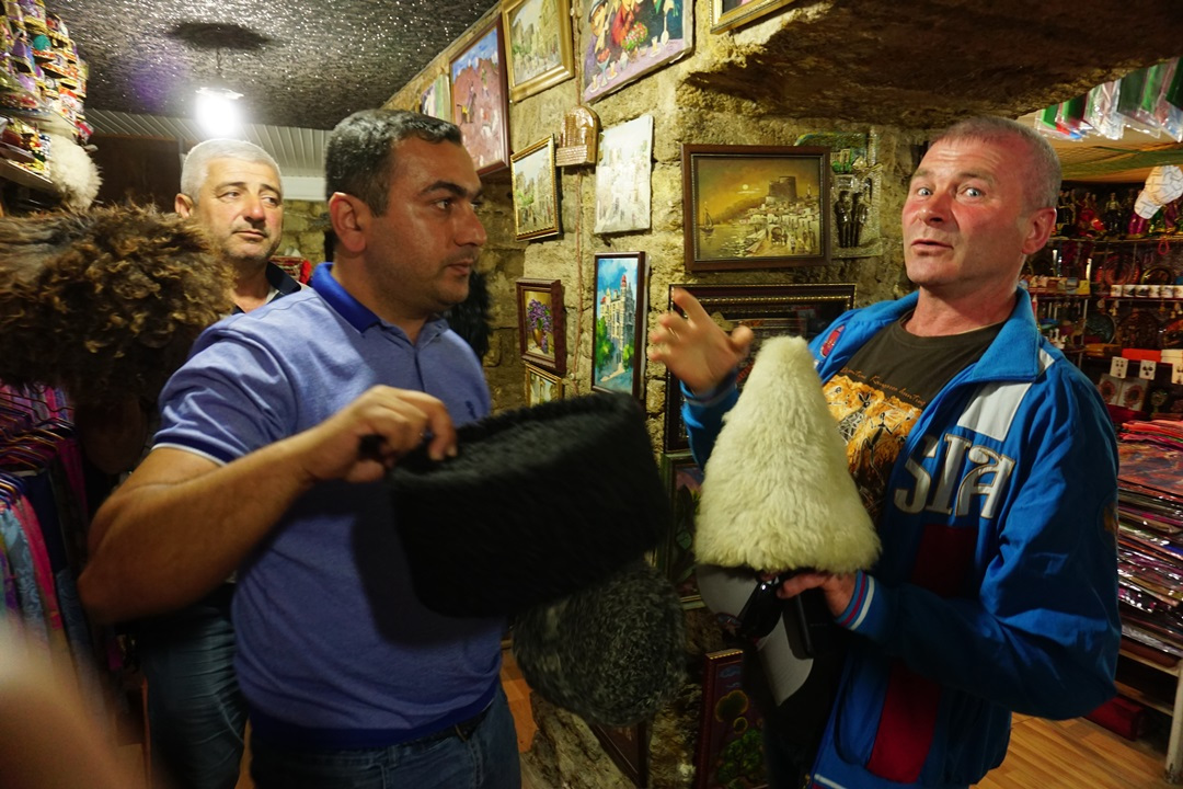 Это – первый экспонат экспедиции, приобретенный для Музея головных уборов народов мира «Дом шляп». Мы радуемся удачной покупке, а заодно примеряем другие папахи.