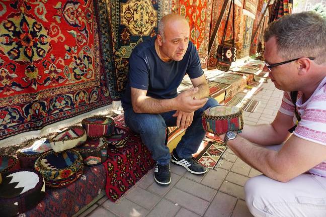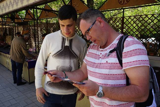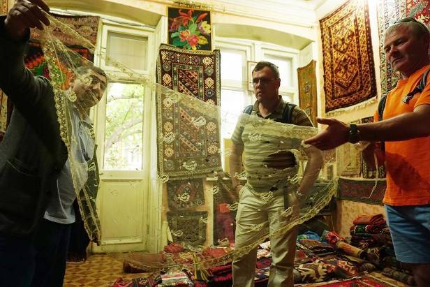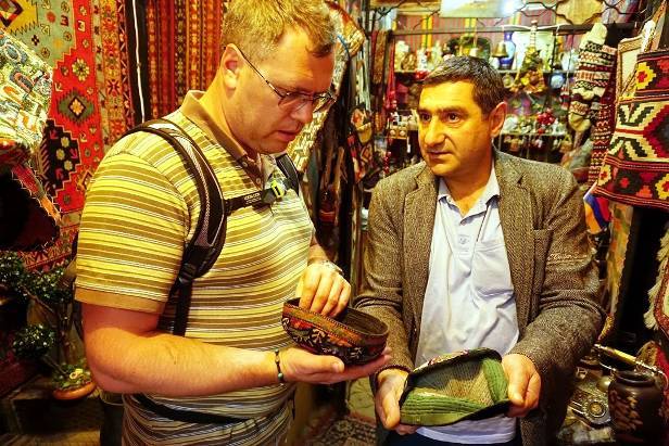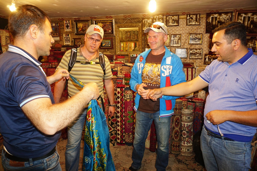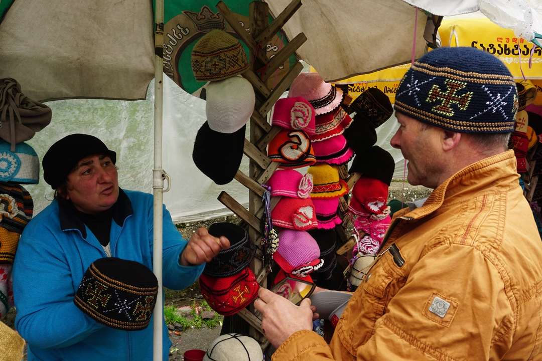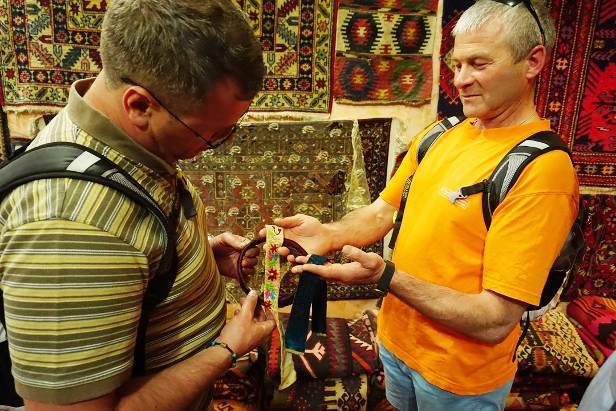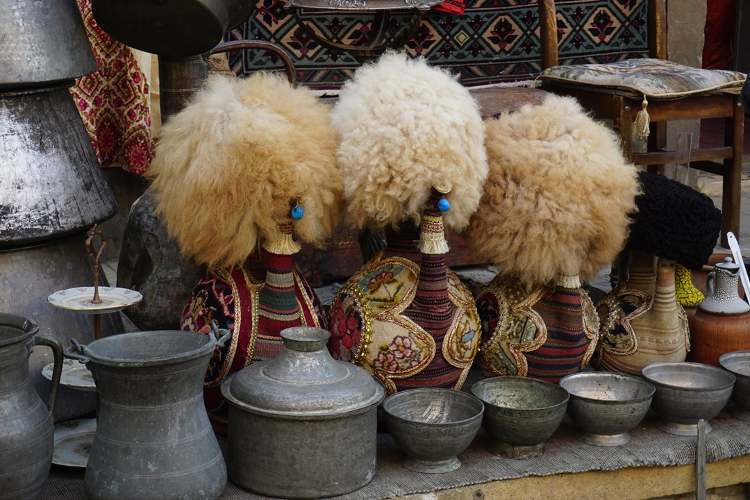 Это – первый экспонат экспедиции, приобретенный для Музея головных уборов народов мира «Дом шляп». Мы радуемся удачной покупке, а заодно примеряем другие папахи.
