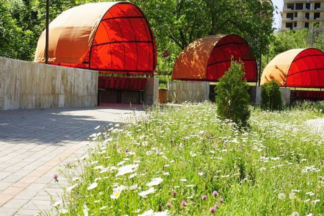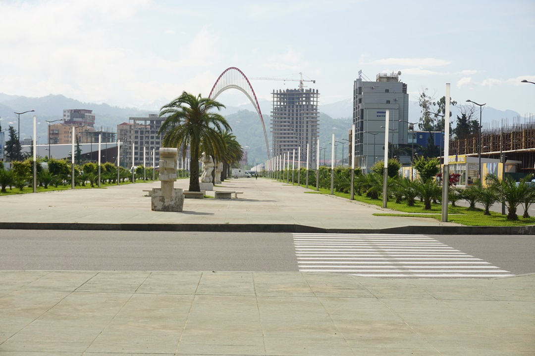 Людей на площади практически нет, нам встретились только двое ребят, катающихся на велосипедах. По другую сторону издалека виден фасад мэрии города, на нем – большие портреты Владимира Путина и Ахмата Кадырова. В городе много зелени, все деревья совсем молодые, старых нет, почему – расскажем позже…