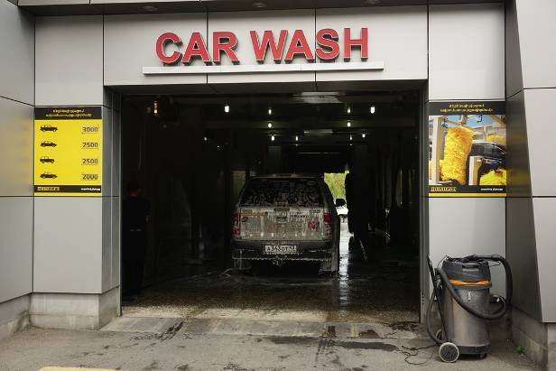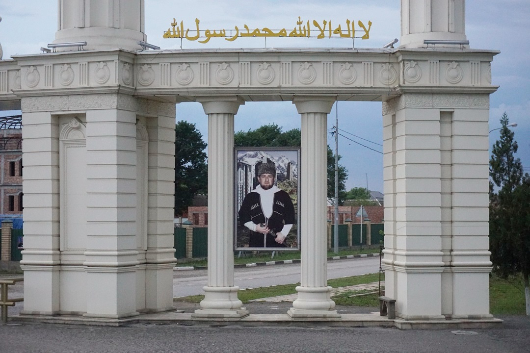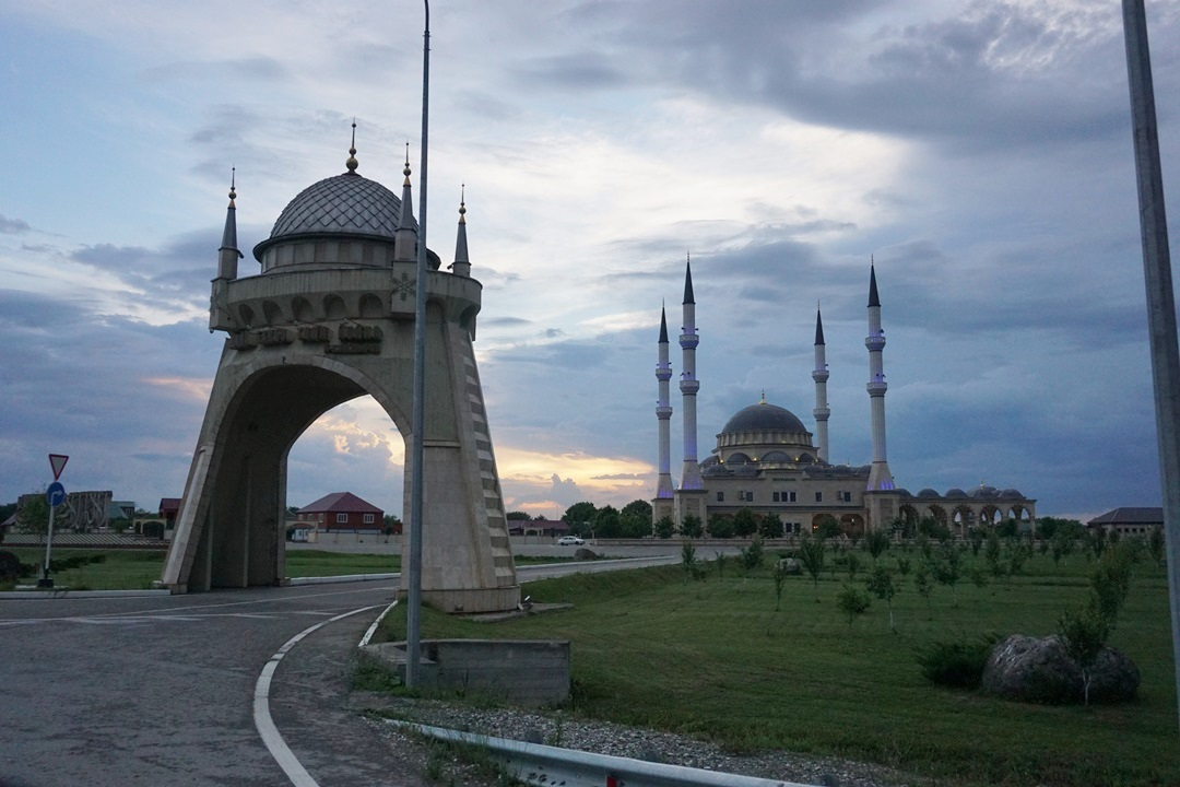 Предварительно заехав на автомойку, направляемся в Грозный, встречающий высокой аркой с портретами Владимира Путина и Ахмата Кадырова. Город встречает ярко освещенными фасадами зданий и переливающимся тысячами зеленых огней куполом огромной мечети. По радио транслируют молитву – это время для вечернего намаза.