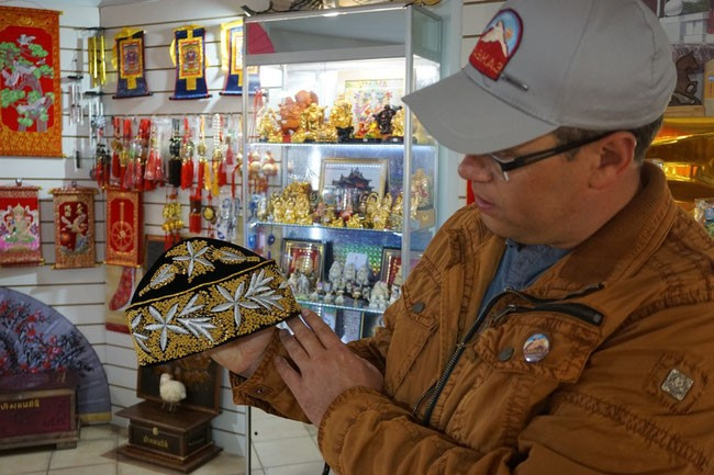 Первым делом мы прицениваемся в сувенирных магазинах, именно здесь обнаруживаем традиционные калмыцкие головные уборы как мужские, так и женские. Конечно, туристам продают современные реконструкции, изготовленные на основе народной традиции.