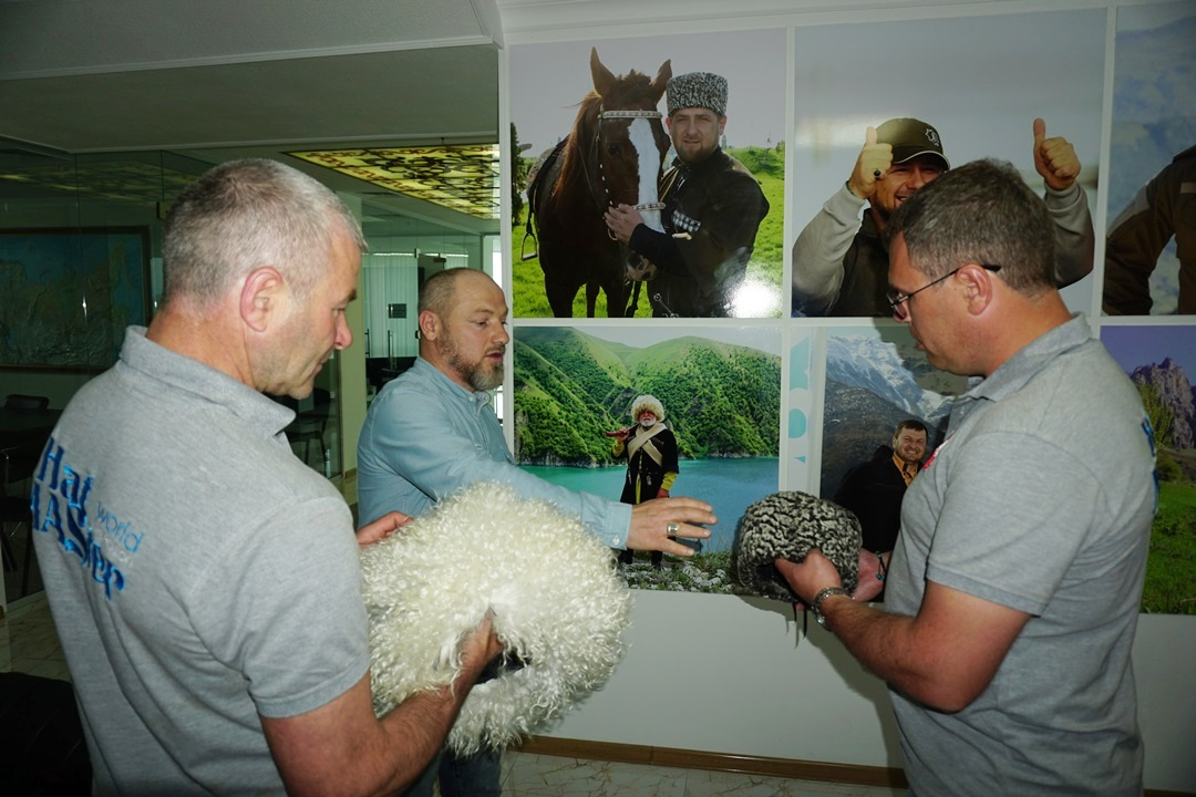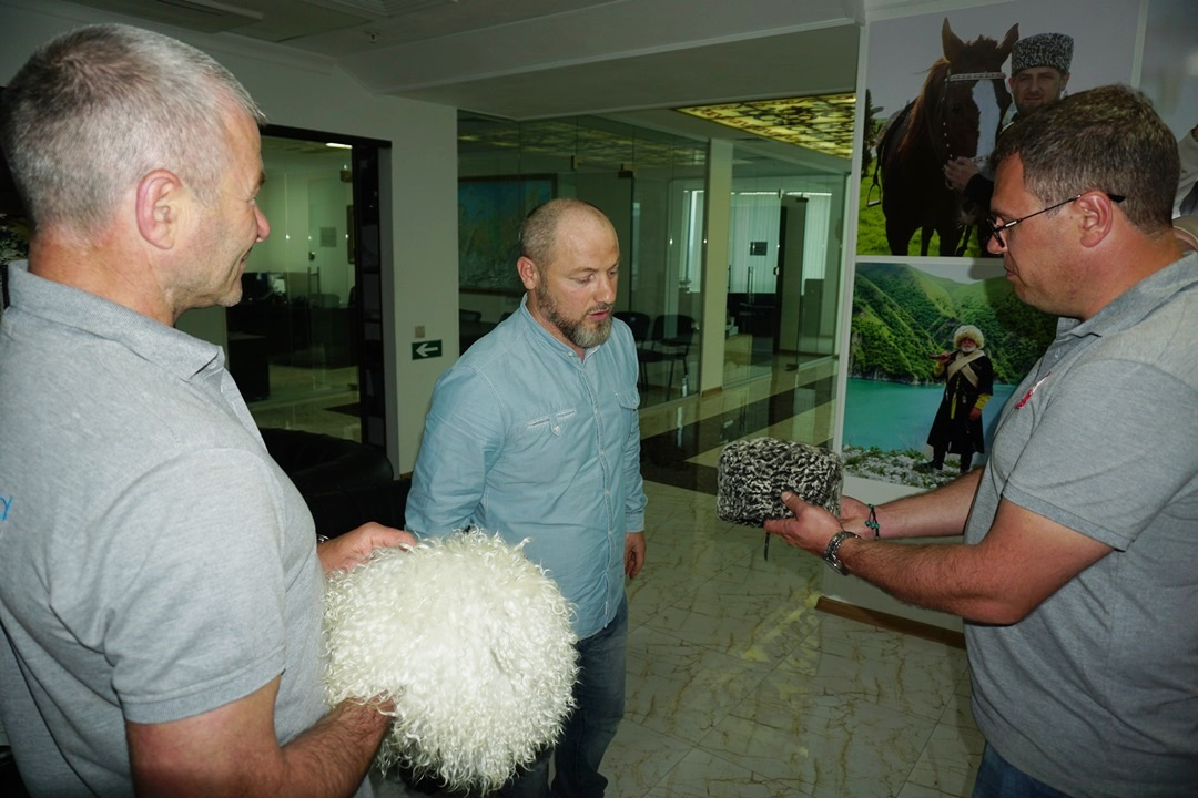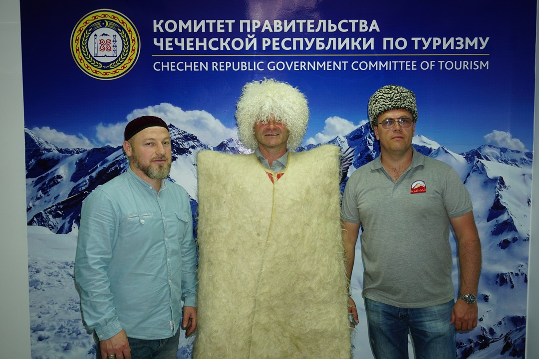 Спустившись несколькими этажами ниже, попадаем в Комитет Правительства Чеченской Республики по туризму, знакомимся с Исмаилом Шовхаловым, начальником отдела развития туризма, получаем от него исчерпывающую информацию о национальных чеченских головных уборах и, более того, два головных убора – в подарок!