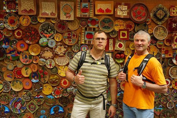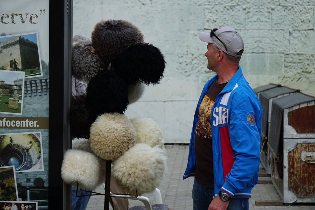 Но нас притянуло седа совсем не это: в одной из лавок обнаруживаем выставленные на продажу казацкие и кавказские папахи! Олег с разрешения продавщицы, добродушной местной жительницы, напоившей нас горячим чаем, примерил самую пушистую папаху, и уже не смог с ней расстаться – уж очень хорош оказался головной убор.