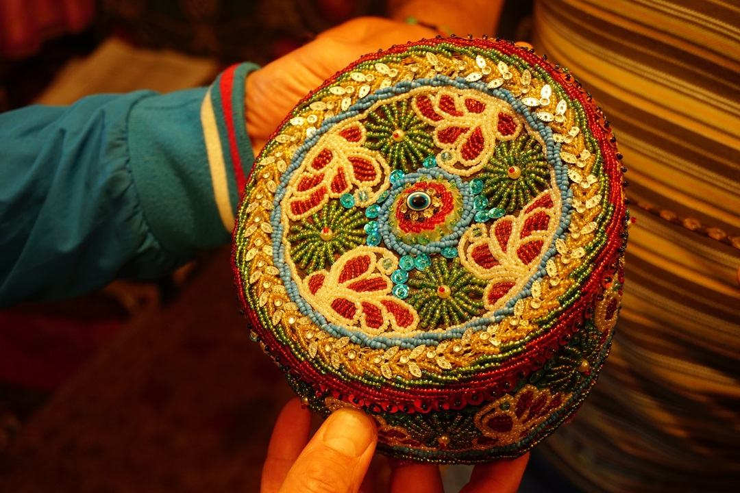 Он носит название «камчатка», нам показали несколько вариантов, один из них стоит 15 000 рублей, украшен вышивкой из настоящей золотой канители, исключительно ручной работы. Конечно, мы очень впечатлены, но пока не осмеливаемся делать дорогостоящие покупки, ведь впереди еще целая экспедиция.
