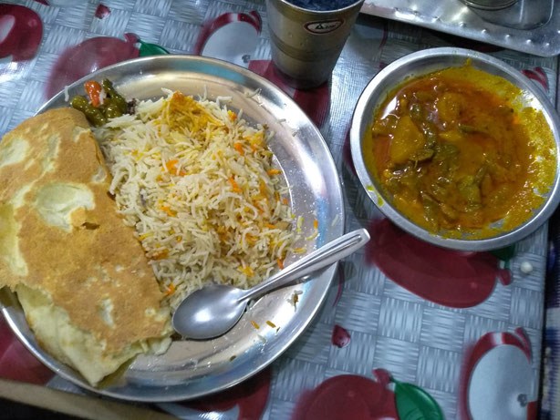 Вечером ели рис, курицу, лепешки, овощной салат, пили чай со специями. Остановились в недорогом отеле за 850 рупий, это 797 рублей.
