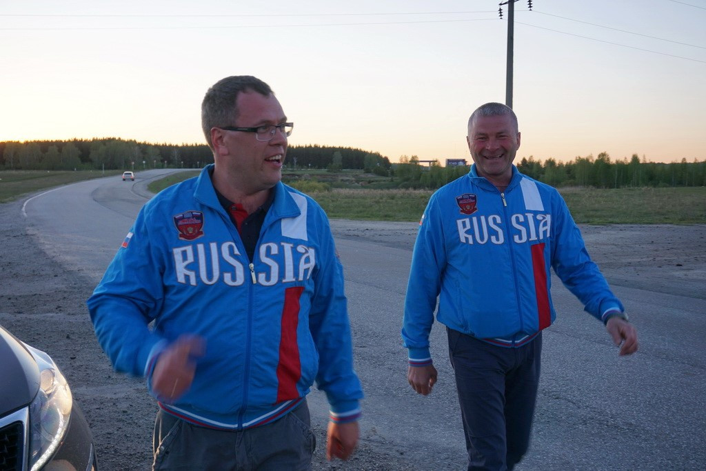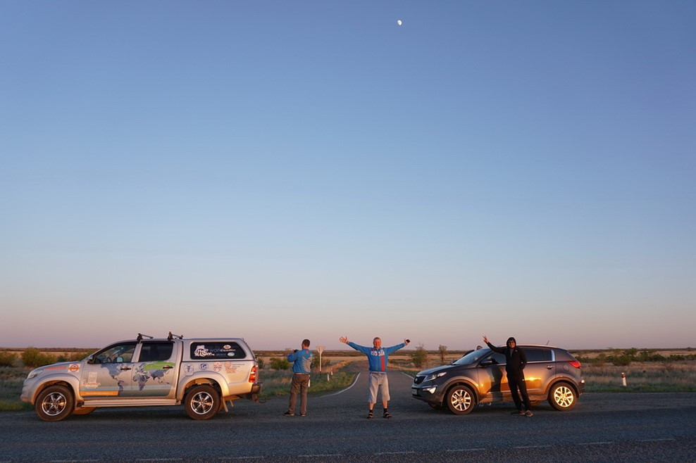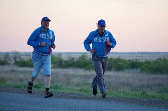На закате Валерий и Олег решили повторить и закрепить опыт вчерашней пробежки по трассе; отогнав автомобиль на три километра вперед, мы некоторое время ждали, пока они вдвоем бежали эту дистанцию. На фоне заходящего за плоский степной горизонт дневного светила две бегущие вдоль трассы фигурки в фирменной форме с надписями «Russia» выглядели убедительно.
