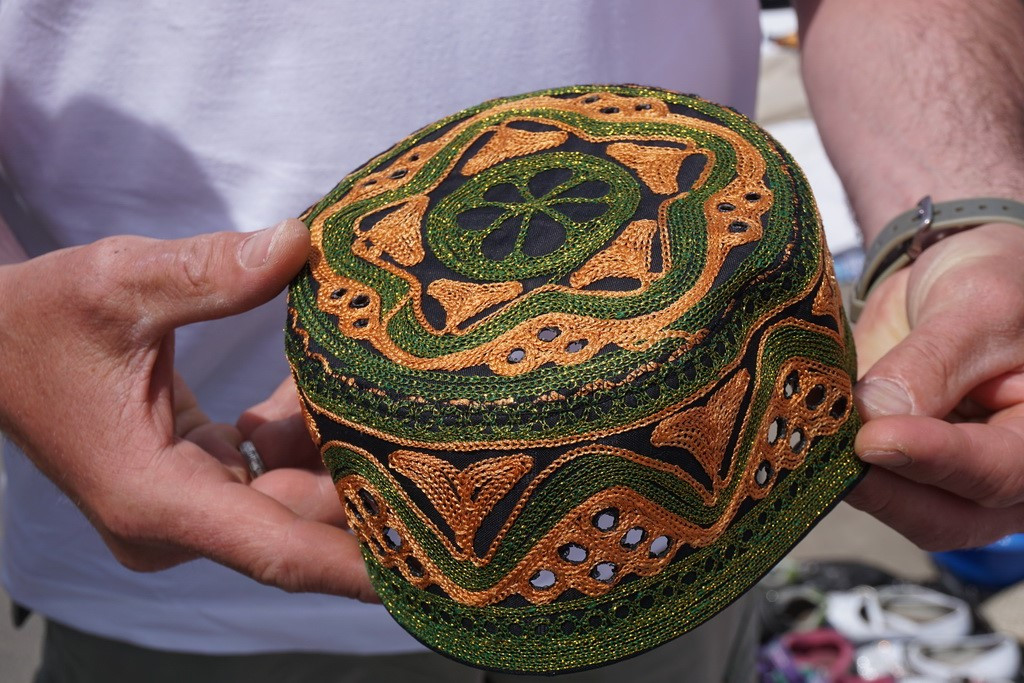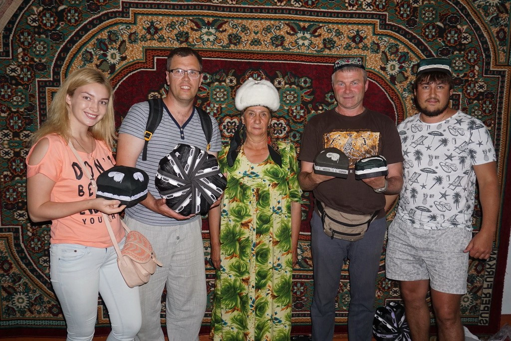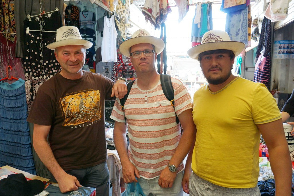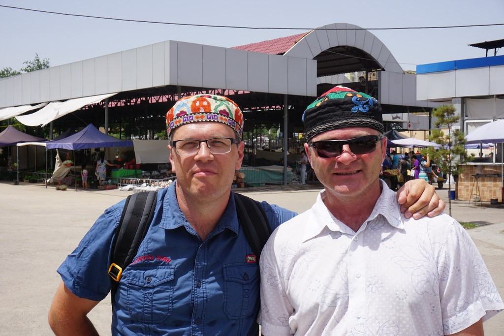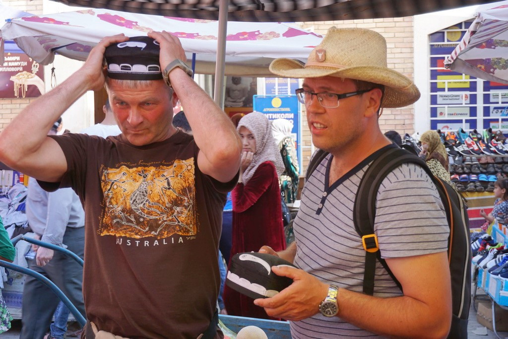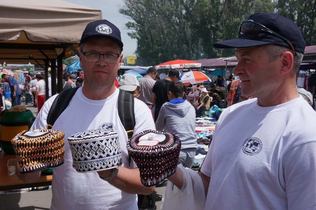 На рынке находим искомое – сувениры для друзей и родных, тем временем Александр Владимирович дарит авторам идеи экспедиции Валерию и Олегу по красочной ферганской тюбетейке в знак признательности за сотрудничество и за преподнесенный дар – символ кругосветной экспедиции “Hat Master” в виде стилизованной шапки-ушанки с павлопосадскими узорами, созданный дружественной компанией ООО «Мехико» в городе Кирове.