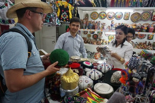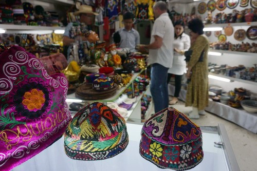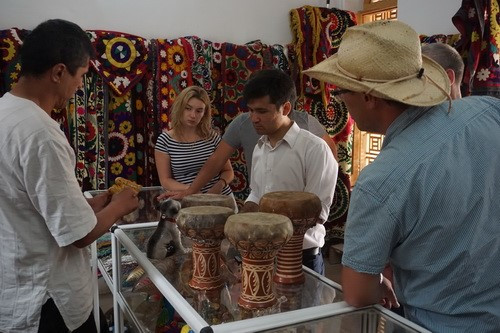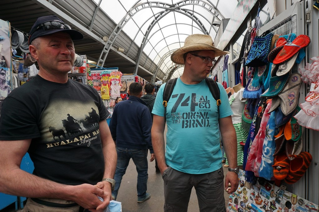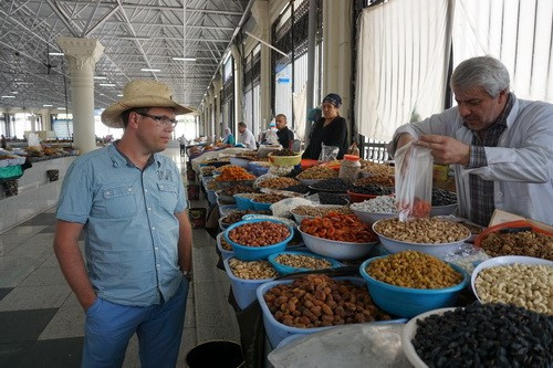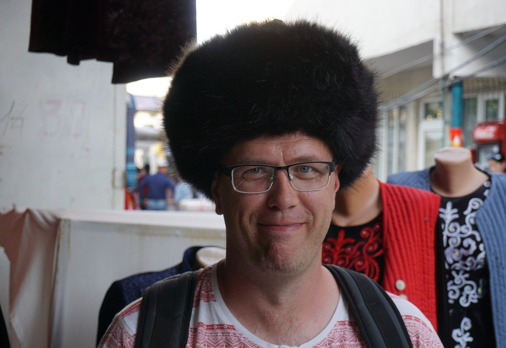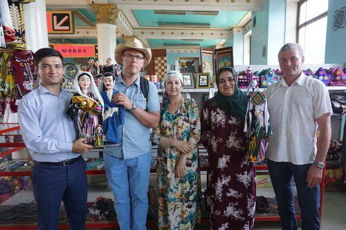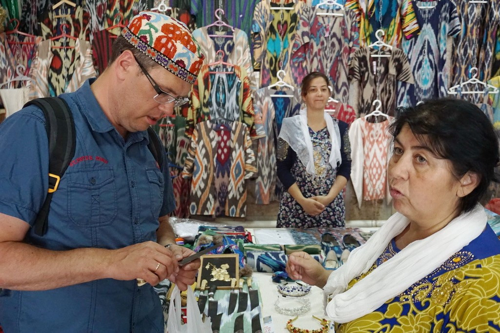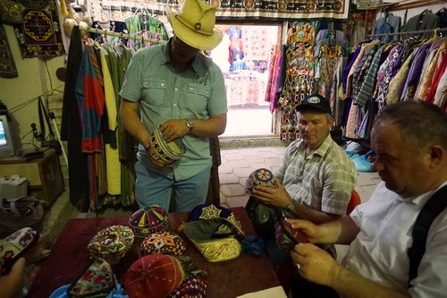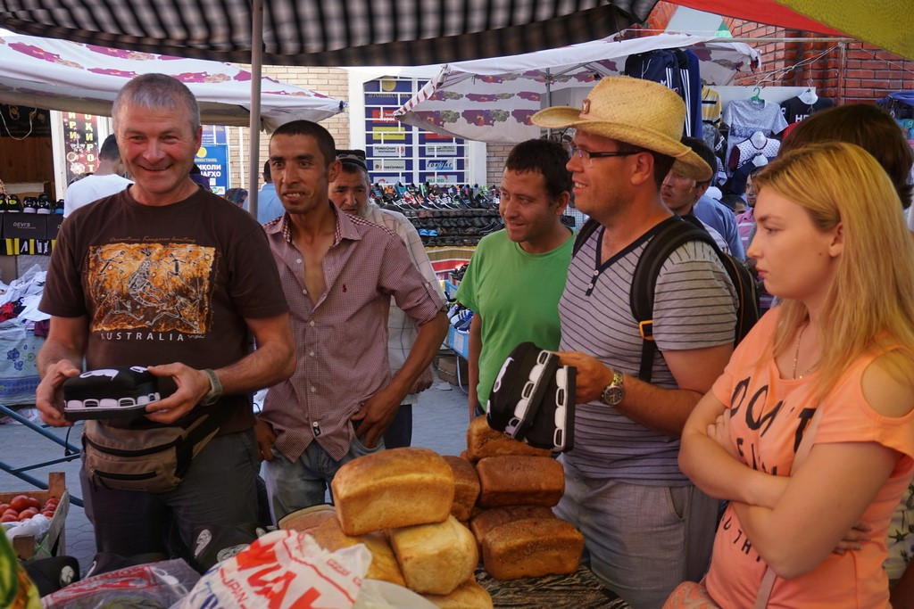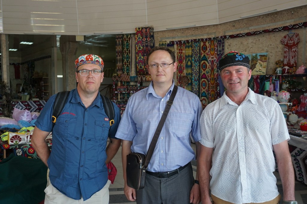На рынке находим искомое – сувениры для друзей и родных, тем временем Александр Владимирович дарит авторам идеи экспедиции Валерию и Олегу по красочной ферганской тюбетейке в знак признательности за сотрудничество и за преподнесенный дар – символ кругосветной экспедиции “Hat Master” в виде стилизованной шапки-ушанки с павлопосадскими узорами, созданный дружественной компанией ООО «Мехико» в городе Кирове.