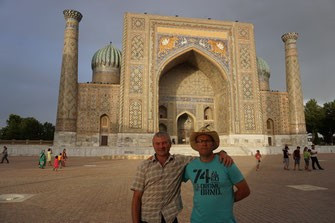 В 20-ти километрах от Турсунзаде пересекаем таджикско-узбекскую границу, где встречаемся с беспрецедентными мерами безопасности и теряем много времени. По плоскогорьям и пустыням юго-восточной части республики Узбекистан добираемся до древнего города Бухара, где по счастливому стечению обстоятельств знакомимся с уникальным, талантливым человеком Рауфом Авезовым, организующим для нас знакомство с памятниками истории и культуры Бухары и окрестностей, здесь же находим множество узбекских национальных головных уборов, отличающихся большим разнообразием. После Бухары экспедиция направилась в Самарканд, где также удалось посетить множество памятников древнего зодчества.