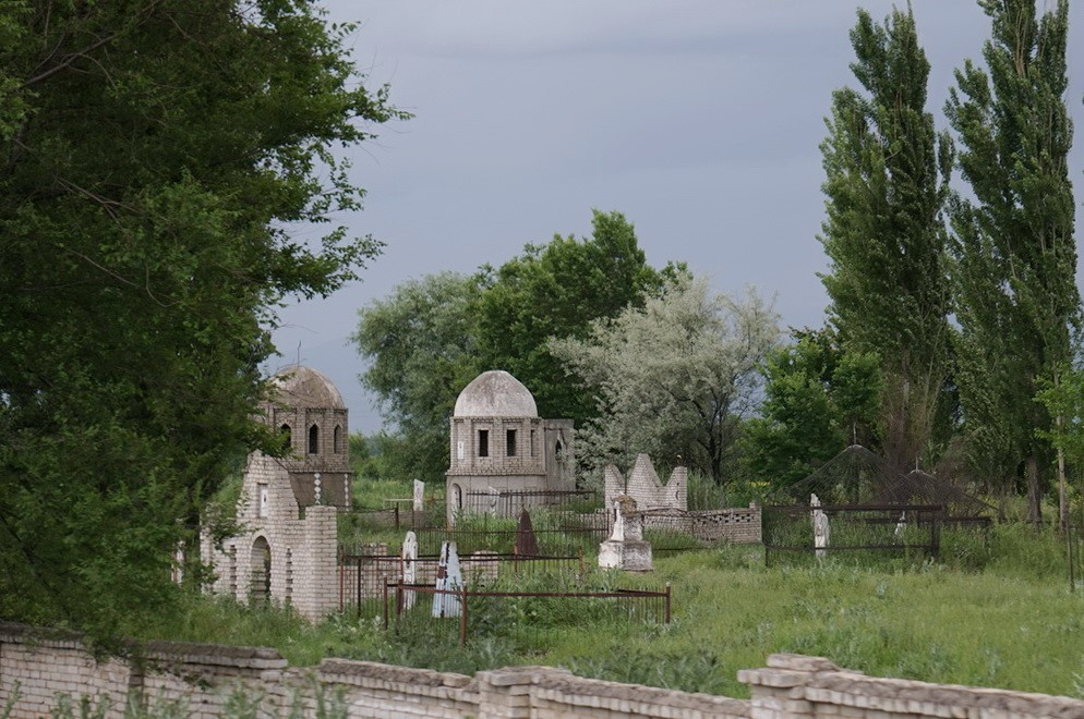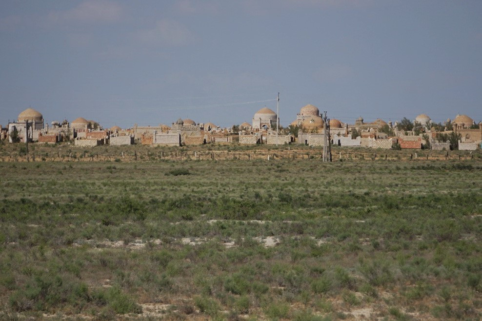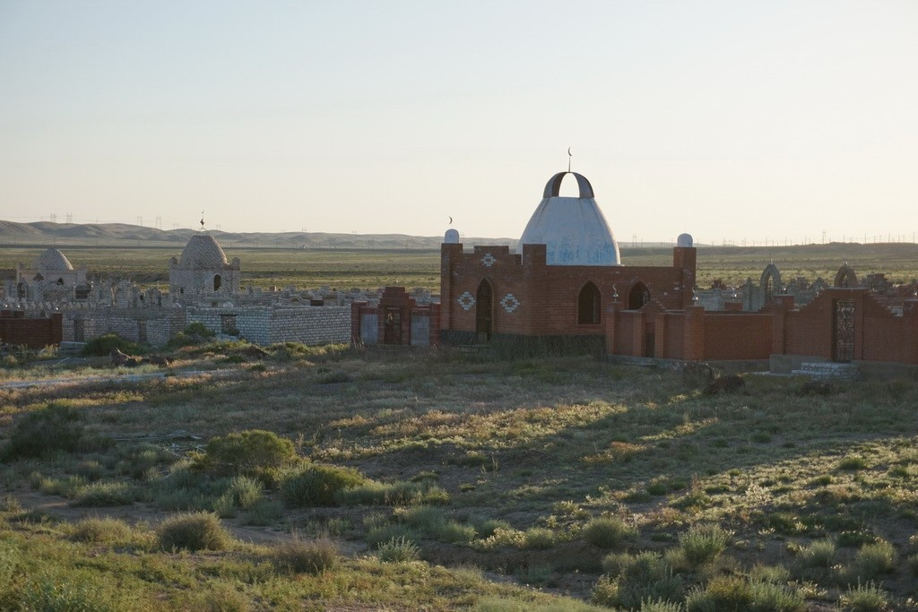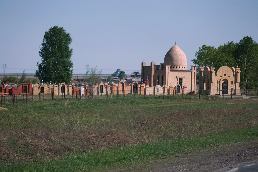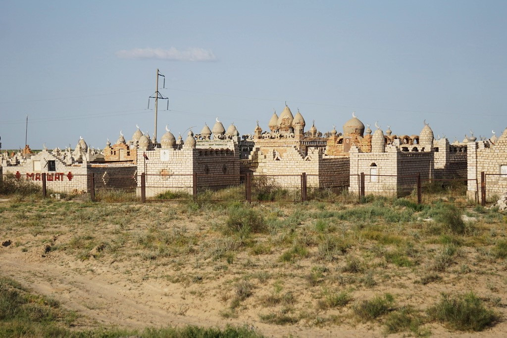 Помимо верблюдов, в этих местах можно встретить грандиозные мусульманские кладбища с монументальными сооружениями – склепами. Форма строений весьма разнообразна, вплоть до зданий, напоминающих мечети с минаретами и высокими заборами. В этой части Казахстана кладбища поистине огромные; в нескольких населенных пунктах наблюдаем забавную картину: за хоромами, построенными для мертвых на кладбищах видны скромные, низкие домики местных жителей, пока еще живых.