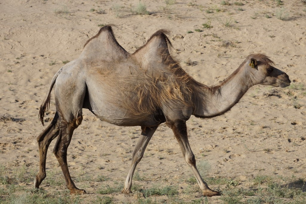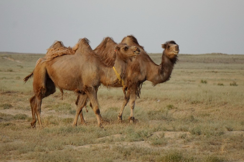 Зато сегодня эти чудесные пустынные животные во всей своей красе предстали перед нами, особенно много их было вечером к северу от Аральского моря. В этих местах встречаются две разновидности верблюдов: одногорбые и двугорбые, окрас их тоже различается от светло-серого и почти белого до рыжего и темно-коричневого. Животные небольшим группами пасутся вдоль трассы, почти у всех на ушах прикреплены бирки с «бортовым» номером и, что вдвойне забавно, со штрих-кодом (!).