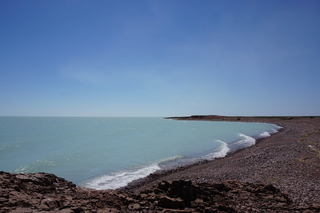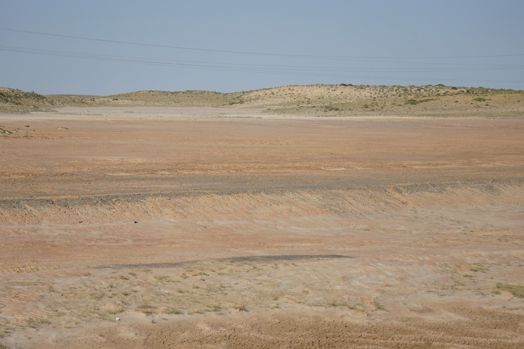 Слева от нас находится северная часть исчезающего с лица планеты Аральского моря, когда-то оно было полноводным и питало влагой обширные земли, ныне превратившиеся в пустыню. С 1960-х годов уровень моря стал быстро снижаться по причине забора воды из основных питающих рек Амударья и Сырдарья с целью орошения, в 1989 году море распалось на два изолированных водоёма — Северное (Малое) и Южное (Большое) Аральское море. К 2014 г. восточная часть Южного (Большого) Аральского моря полностью высохла, достигнув в этот год исторического минимума площади всего моря в 7297 км².