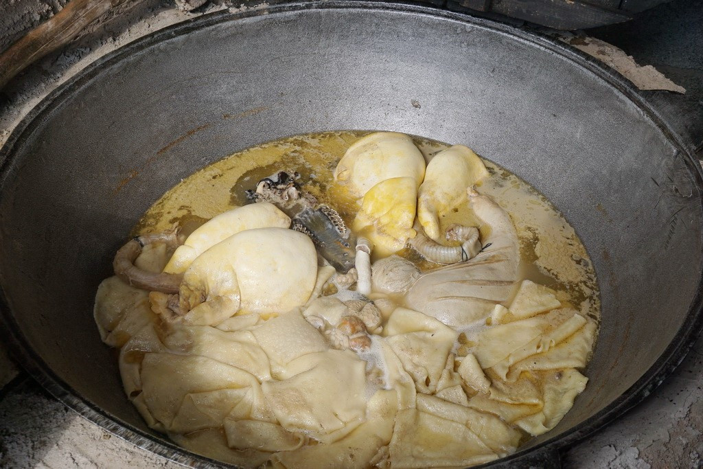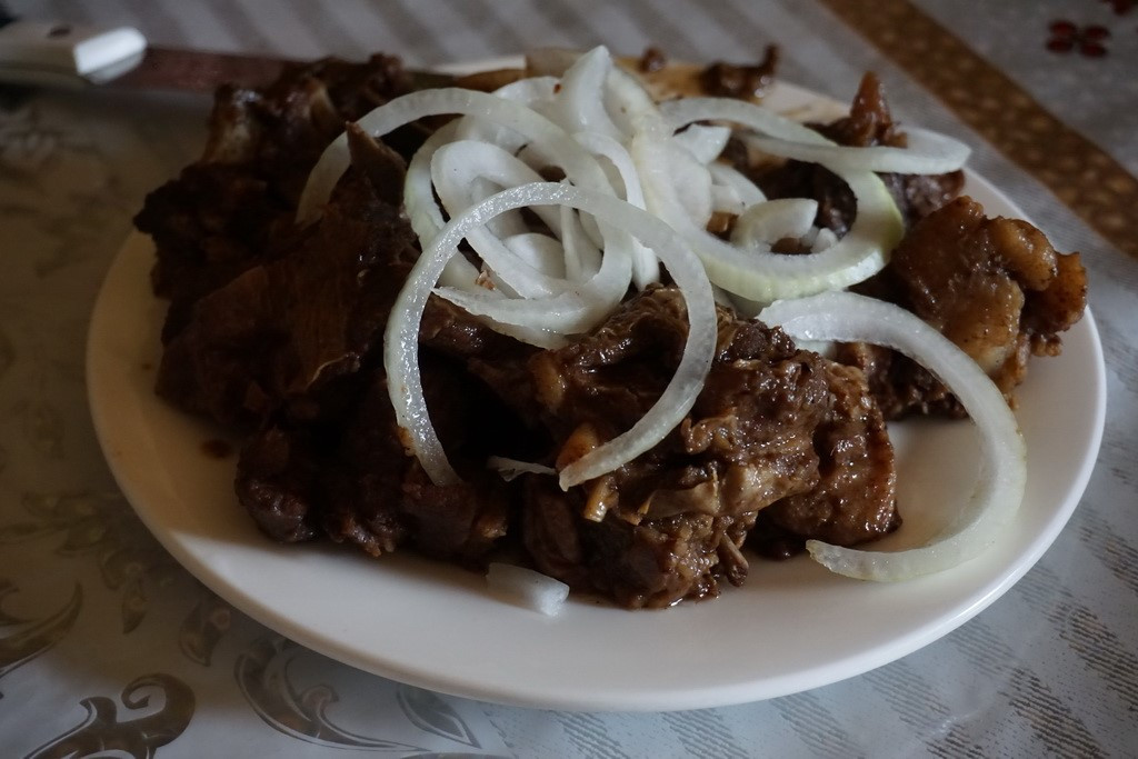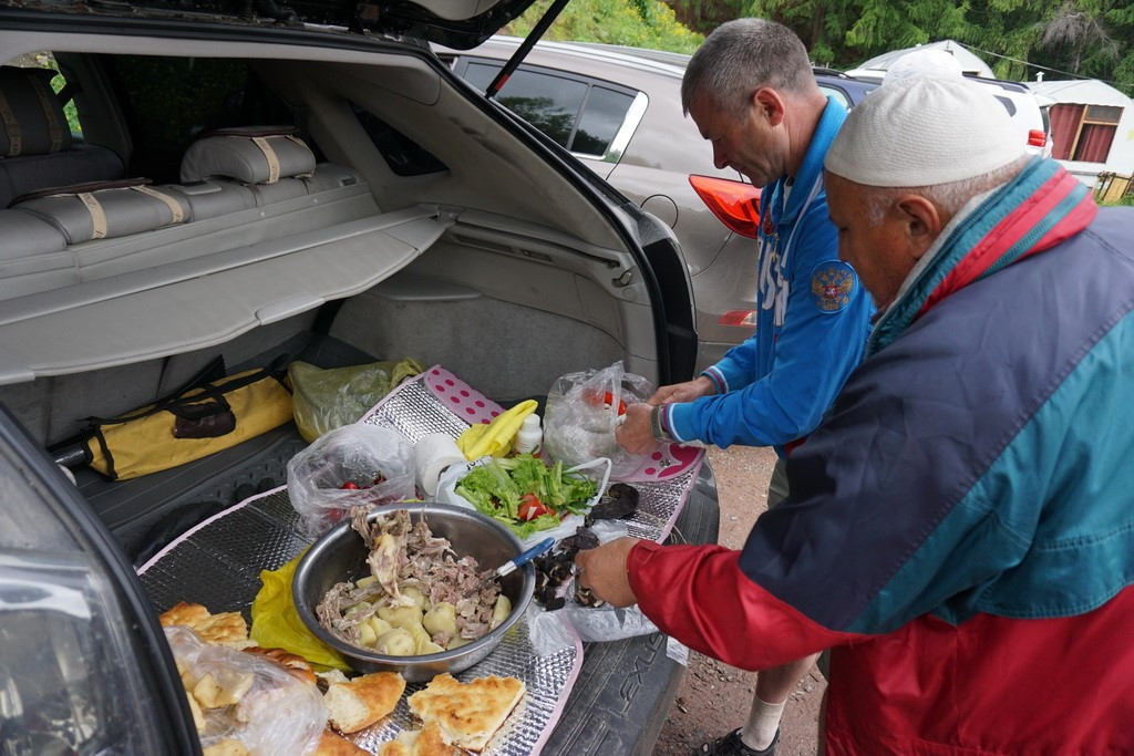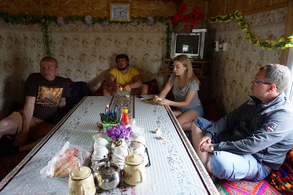 Через несколько километров мы заехали в первое кафе, встретившееся на территории Казахстана после границы. За большим столом обедает большая компания казахов, судя по всему, дальнобойщиков, весело хохоча и жестикулируя. Заказываем блюда местной национальной кухни, пытаясь попробовать что-нибудь традиционное. Но все равно не покидает ощущение того, что мы все еще в России.