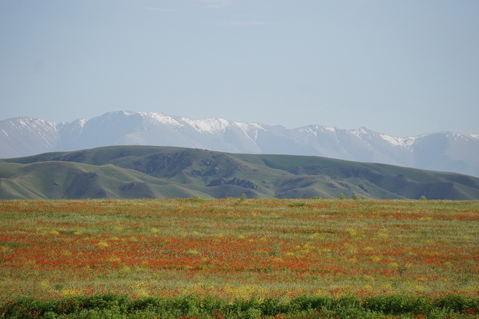 Пейзажи со вчерашнего вечера разительно изменились: вместо иссушенных пустынь мы едем по зеленой, цветущей степи, в балках встречаются взрослые деревья, временами видим живописные речки. Природа в этих местах более благосклонна к человеку и всем живым существам, нежели, например, в окрестностях Арала. В степи поблескивает на солнце своими длинными колосками ковыль, пахнет чабрецом и полынью.