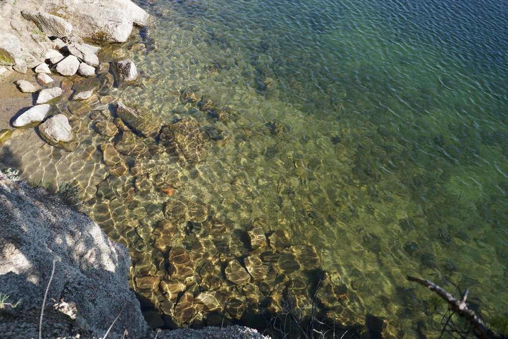 Мы стоим на высоком берегу, поросшем сосновым бором, внизу плещется вода, внешне похожая на морскую, сквозь нее сколько хватает света, видно чистое дно, усеянное крупными камнями.