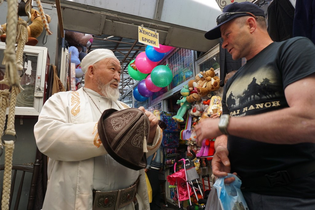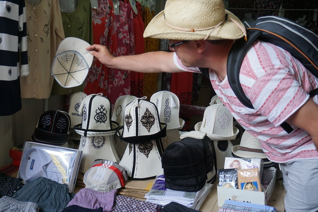 К тому же, цены оказываются раза в два выше, чем в фирменных магазинах мастерской по пошиву национальной одежды. Тем не менее, мы нашли малахай, даже несколько, пусть и не приобрели их сразу. Рассчитываем еще вернуться сюда в рабочий день, возможно, даже на обратном пути из экспедиции (в зависимости от выбранного маршрута).