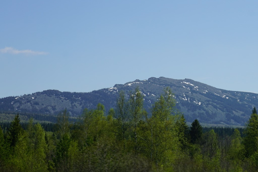Трасса петляет между отдельными покатыми вершинами, в межгорных долинах текут по-весеннему полноводные реки; по мере набора высоты меняется состав растительности, преобладают сосны, ели и даже лиственницы, в подлеске появились первоцветы, трава еще не успела вырасти. На самом высоком перевале в этой части Урала, который чуть выше отметки в 500 метров над уровнем моря, обнаруживаем недавно выпавший снег, медленно тающий на ярком весеннем солнце.