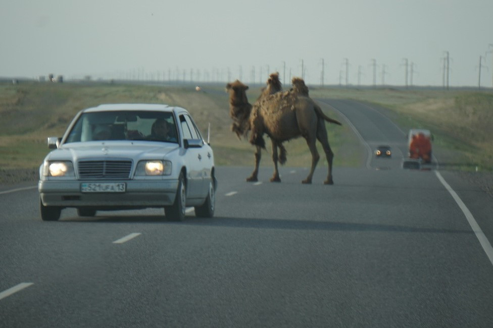 Но это всего лишь мечты, в Казахстане на самом деле мы встретились с феноменом: через голые степи и пустыни проходит современное шоссе, ничем не уступающее по качеству знаменитым американским хайвеям.