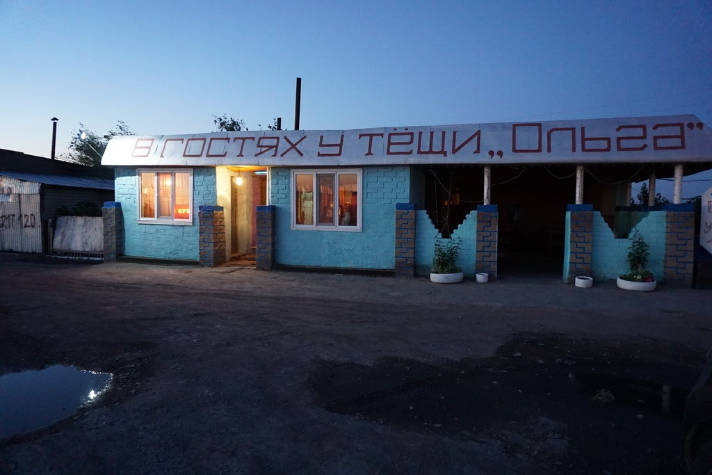 Усталость дает о себе знать, вот вдали появляются электрические огни большого населенного пункта, мы начинаем присматриваться к указателям в надежде найти место для ночлега. Через несколько километров на повороте в сторону Алматы находим искомое – комплекс из кафе и хостела, в котором ко счастью имеются номера.